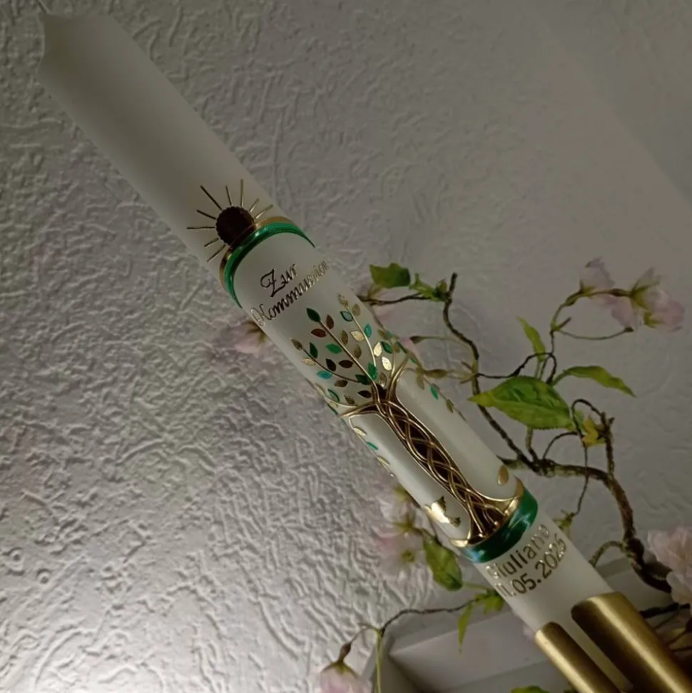 Kommunionkerze Taufkerze lang Lebensbaum Baum Regenbogen Sonne Fische Jungen Name Datum individualisierbar 400/40 mm