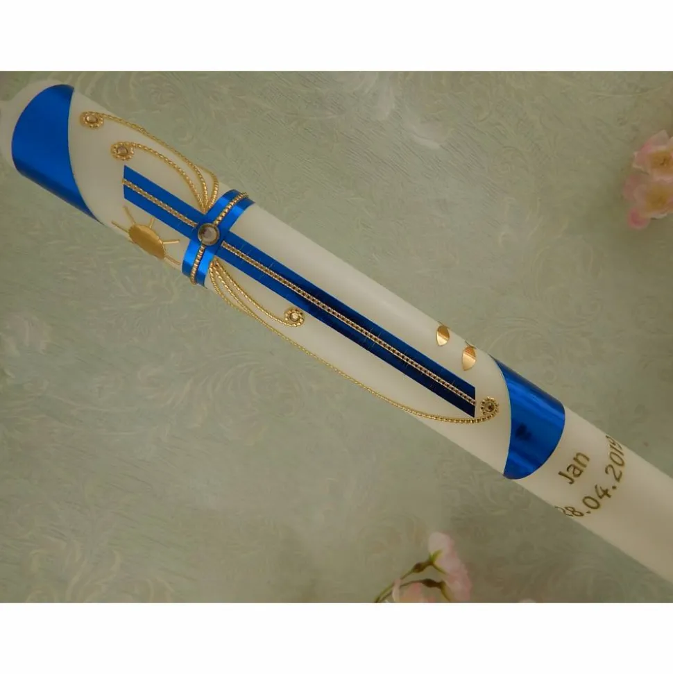 Kommunionkerze Taufkerze lang Mädchen Jungen blau gold Kreuz Taube Schleife Name Datum individualisierbar 300/50 mm oder 400/40 mm