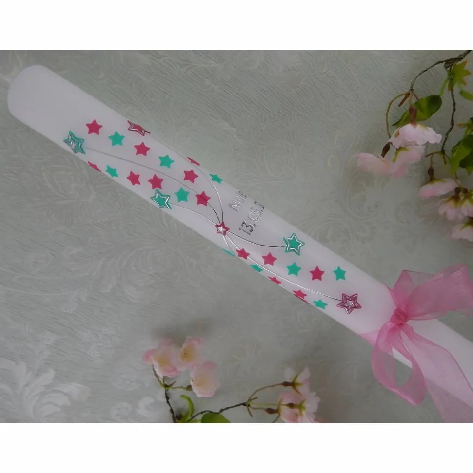Kommunionkerze Taufkerze lang Mädchen Jungen bunt silber Sterne Name Datum individualisierbar