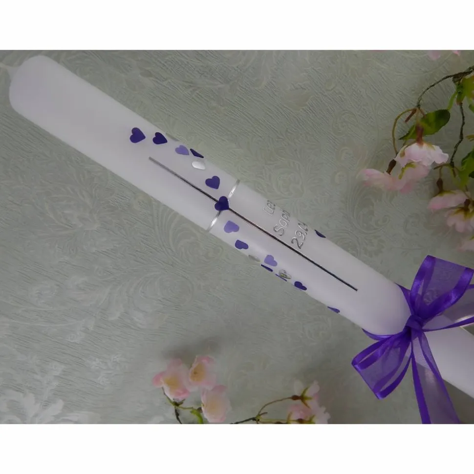 Kommunionkerze Taufkerze lang Mädchen Jungen lila silber Herzen Name Datum individualisierbar