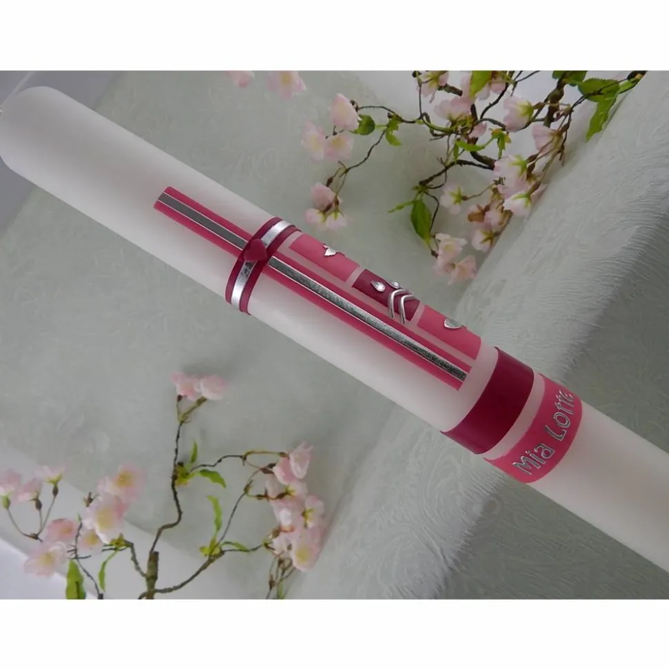 Kommunionkerze Taufkerze lang Mädchen Jungen violett pink silber Kreuz Taube Fisch Schleife Name Datum individualisierbar 400/40 mm oder 400/40 mm