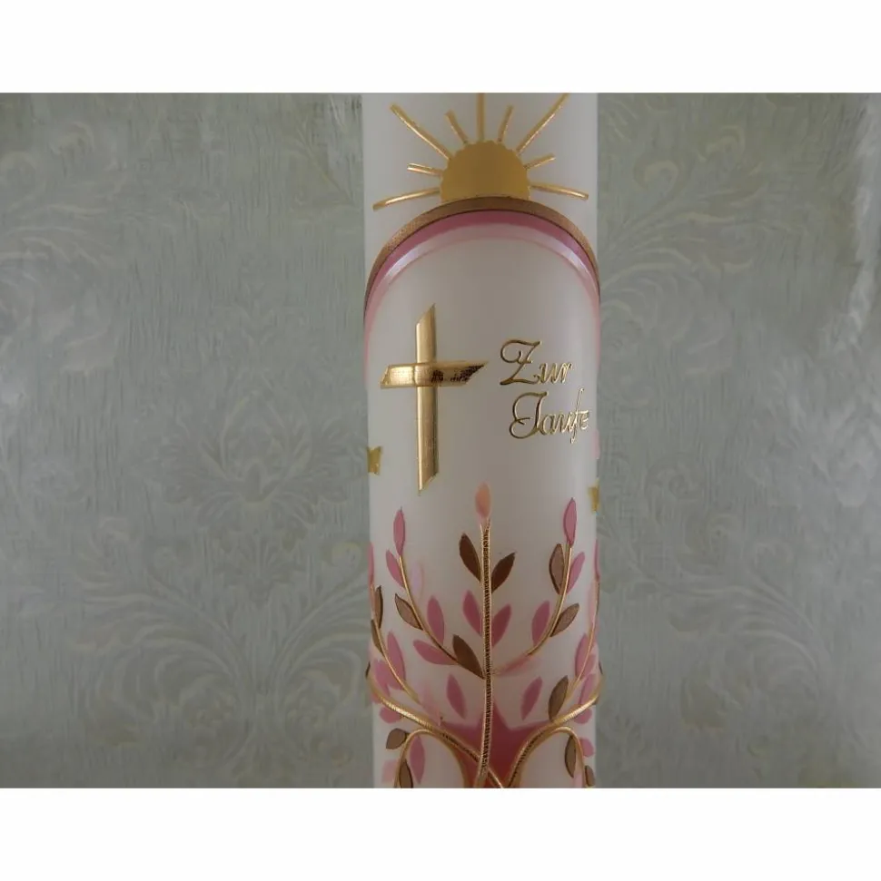 Kommunionkerze Taufkerze lang Mädchen Lebensbaum rosa gold Baum des Lebens Kreuz Regenbogen Name Datum individualisierbar 400/50 mm
