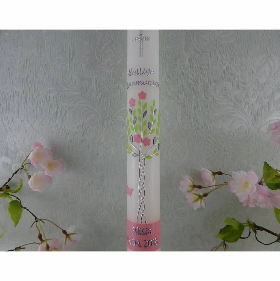 Kommunionkerze Taufkerze lang Mädchen Lebensbaum rosa grün silber Baum des Lebens Kreuz Sterne Name Datum individualisierbar