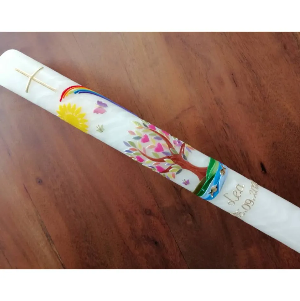 Taufkerze oder Kommunionskerze Lebensbaum mit hochwertigen Wachsverzierungen