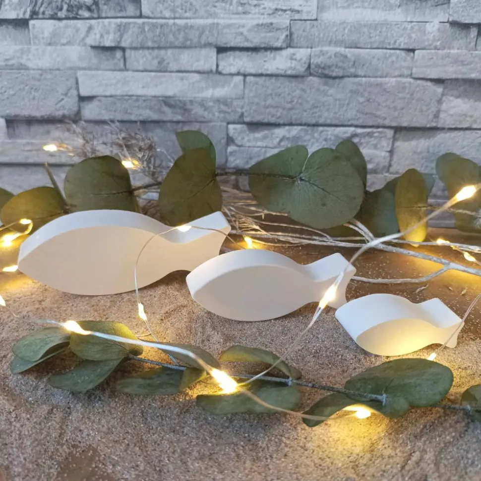 Edles Material mit besonderem Charme: Die Fische werden aus Raysin oder Keraflott gefertigt – ein feines, weißes, geruchsneutrales Gießpulver auf Gipsbasis. Leichte Unregelmäßigkeiten und Lufteinschlüsse sind typisch und machen jedes Stück zu einem Unikat.