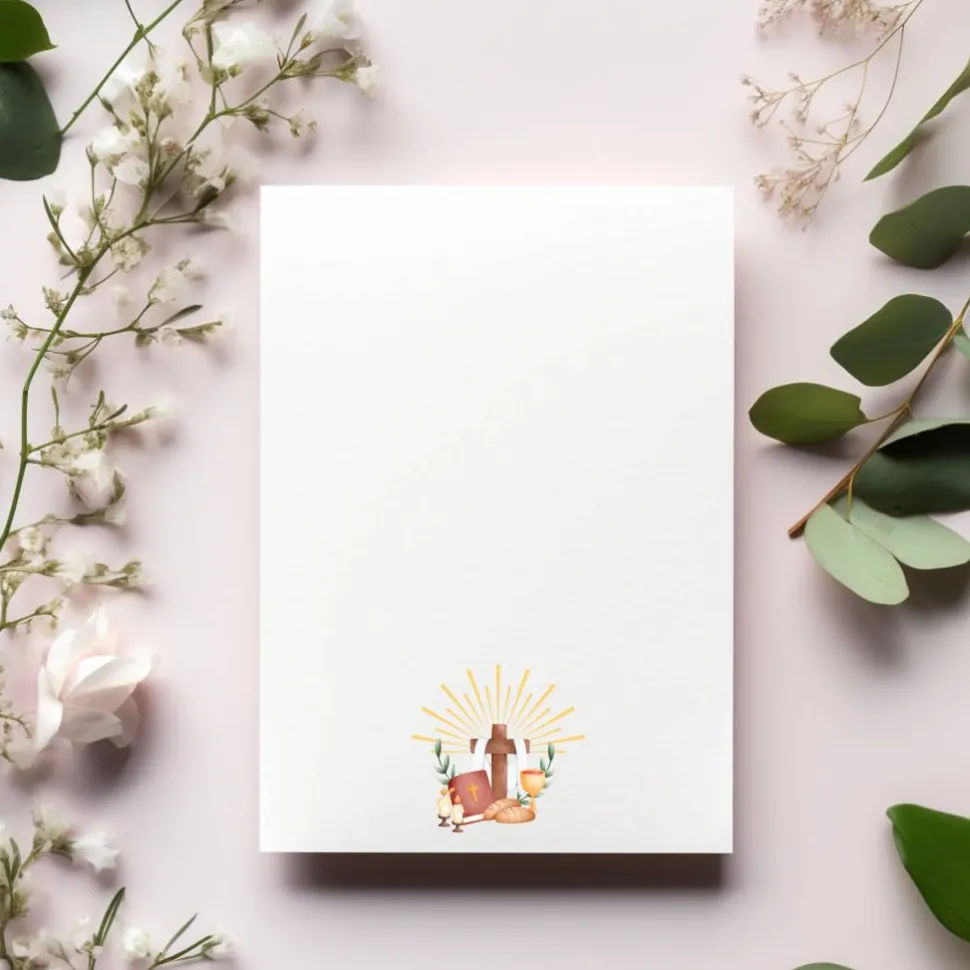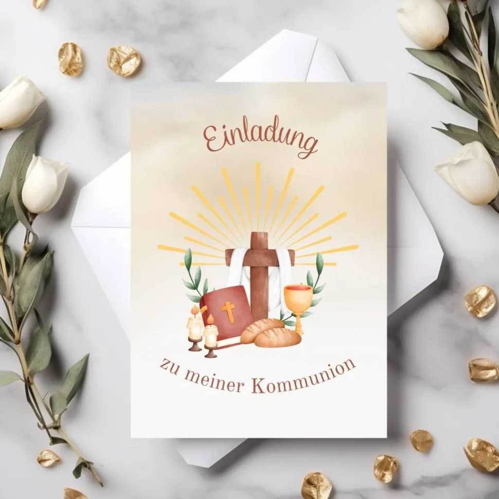 Diese Kommunionseinladungskarten eignen sich perfekt für Mädchen und Jungen gleichermaßen und verleihen jeder Einladung zur Kommunion eine festliche, liebevolle und persönliche Note. Es ist ideal, um den großen Tag stilvoll anzukündigen und die Freude auf das besondere Ereignis zu teilen. Mit seinem strahlenden, religiösen Motiv, den passenden Umschlägen und dem durchdachten Innentext ist dieses Set ein wunderschöner Begleiter für eine unvergessliche Kommunion – schlicht, elegant und voller Symbolkraft.