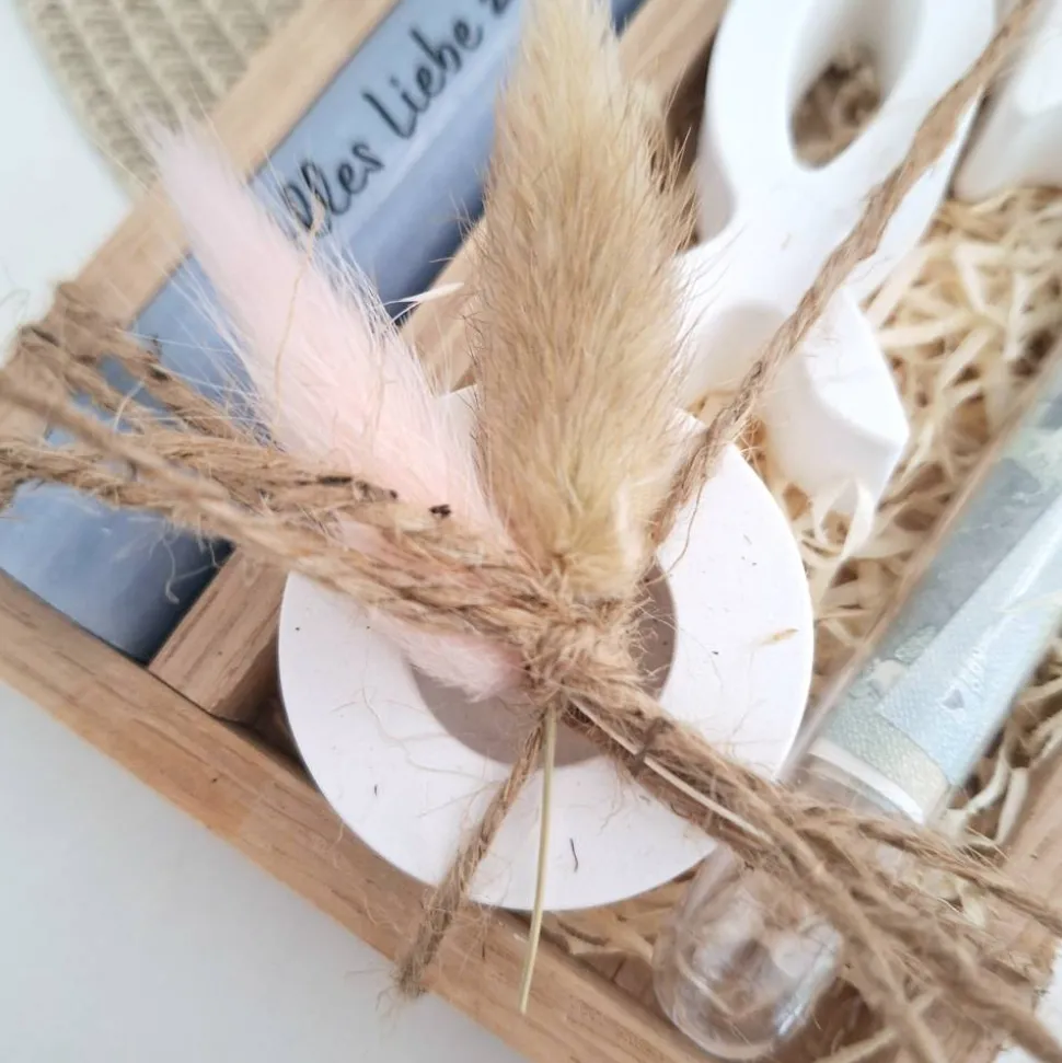 Das Set wird in einem Holzrahmen mit Trockenblumen zusammengebunden und kann so direkt verschenkt werden.