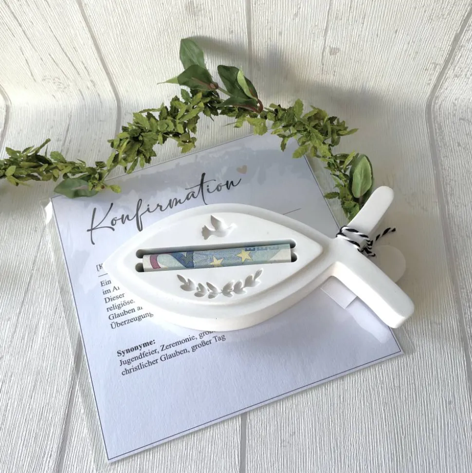 Dieses schöne Geschenkset beinhaltet einen Fisch (14,5×6,6x2cm) als christliches Symbol mit einer passenden Karte (15x15cm). Hier kannst Du einen Gutschein oder Geldschein schön verschenken. Zum Lieferumfang gehört noch eine einfache Karte (keine Klappkarte) mit der passenden Aufschrift dazu. Auf der Rückseite könnt Ihr einen entsprechenden Gruß an die Beschenkten hinterlassen.