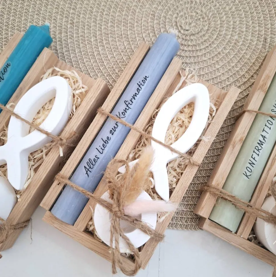 Das Set besteht aus einer Kerze (in der Farbe deiner Wahl) mit einer Aufschrift deiner Wahl, einem Fisch (Var. 1) und einem Kerzenhalter in runder Form.
