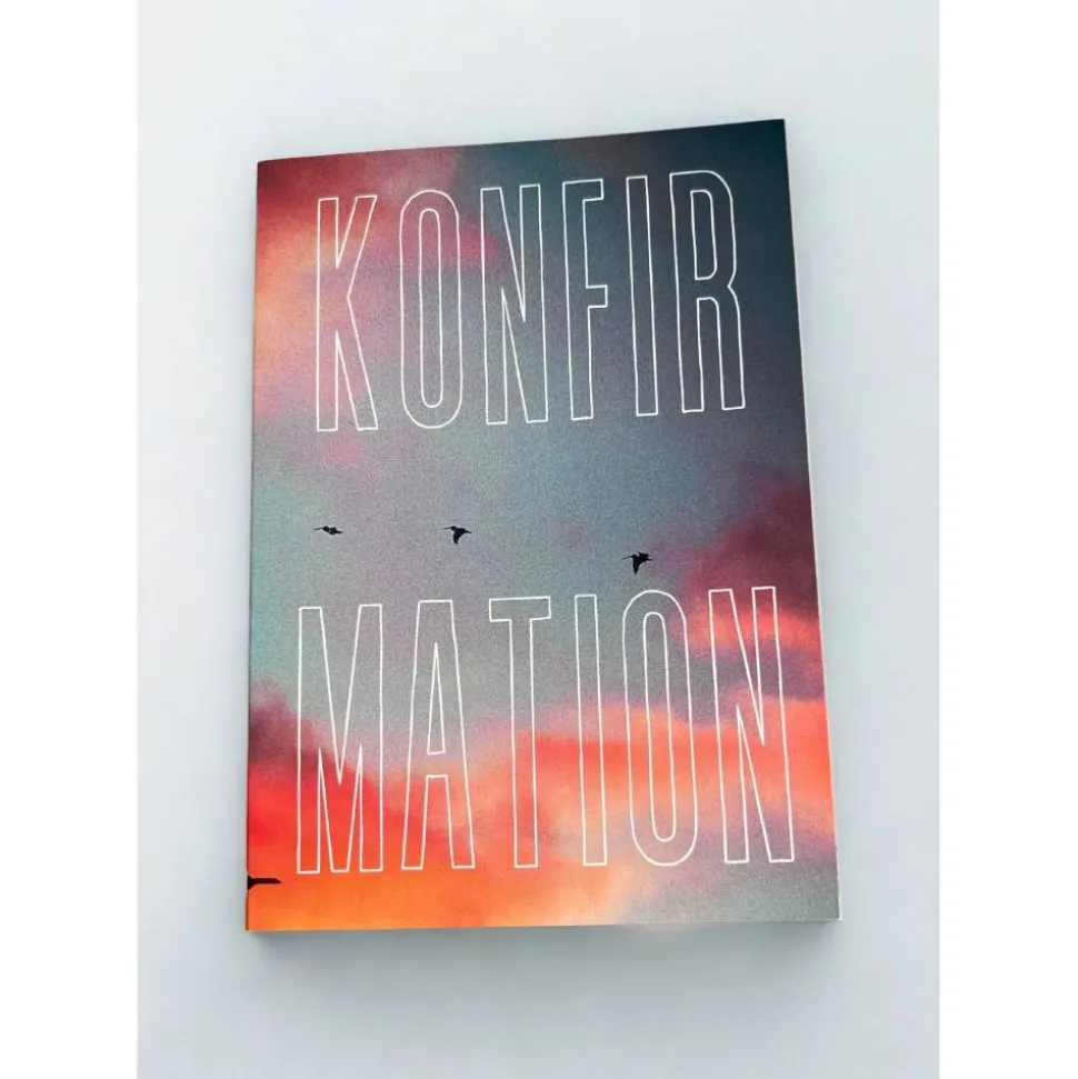 • Vorderseite: Die moderne, filigrane Outline-Typografie des Wortes „KONFIRMATION“ lässt das Hintergrundmotiv – einen weiten Abendhimmel – durchscheinen.