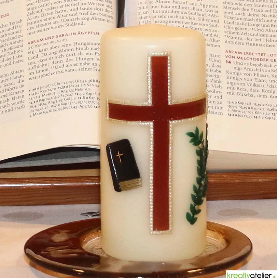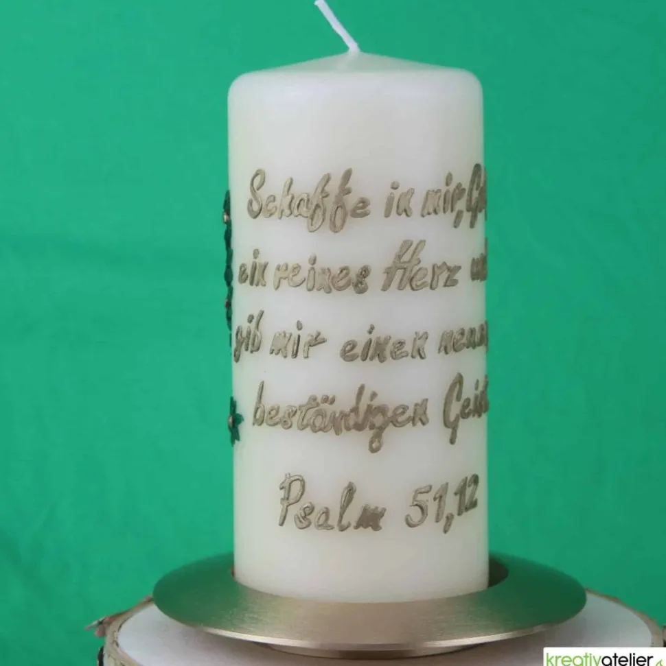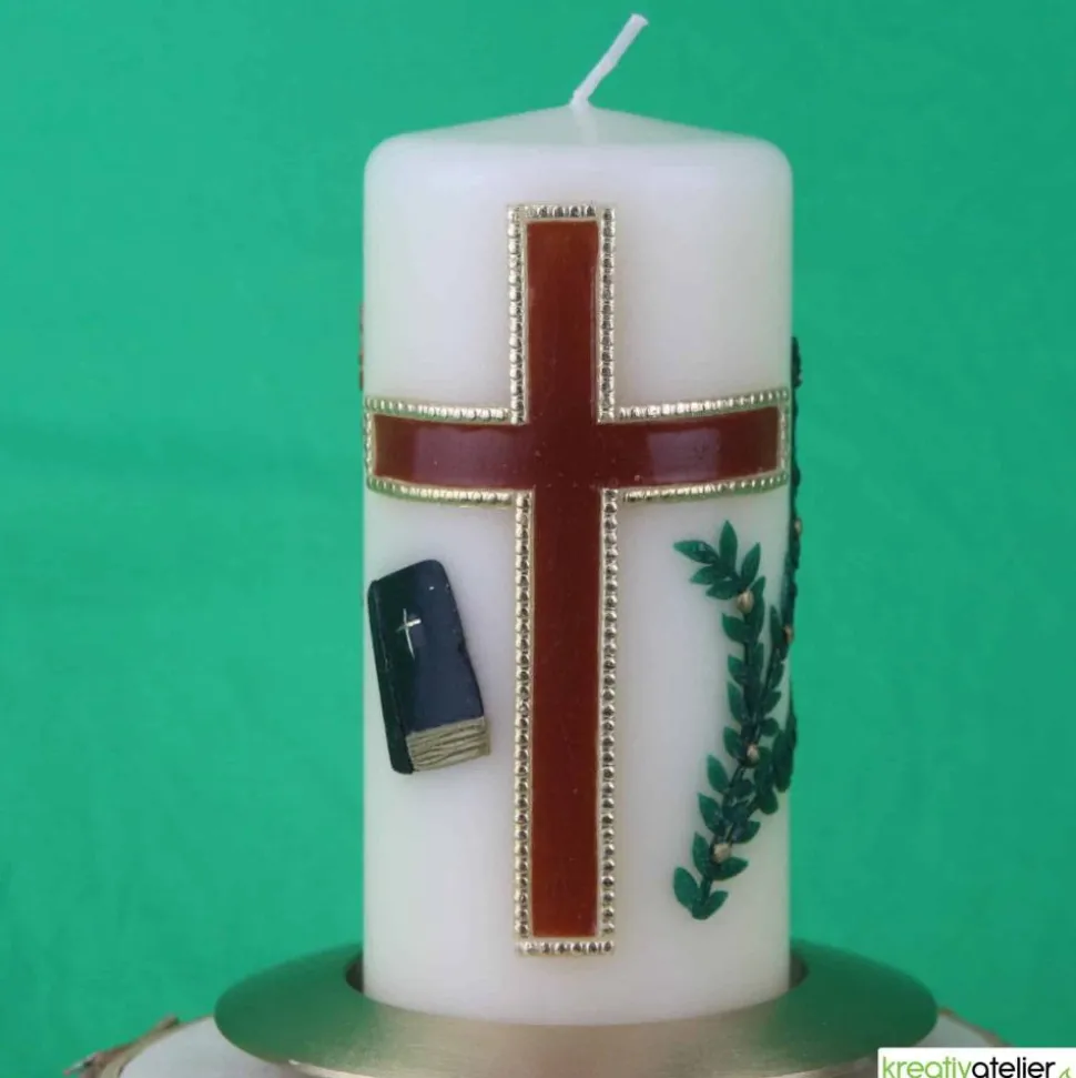 Die Konfirmationskerze kann mit Namen und Datum personalisiert werden. Zusätzlich kann der Konfirmationsspruch (max. 80 Zeichen sind im Preis enthalten) auf der Rückseite der Kerze in Echtwachsbeschriftung aufgebracht werden. Dies verleiht der Kerze etwas Edles, Erhabenes. Diese Konfirmationskerze wird in meinem Atelier individuell für Sie gefertigt. Meine Rohlinge werden in Deutschland gefertigt und sind qualitativ hochwertig.