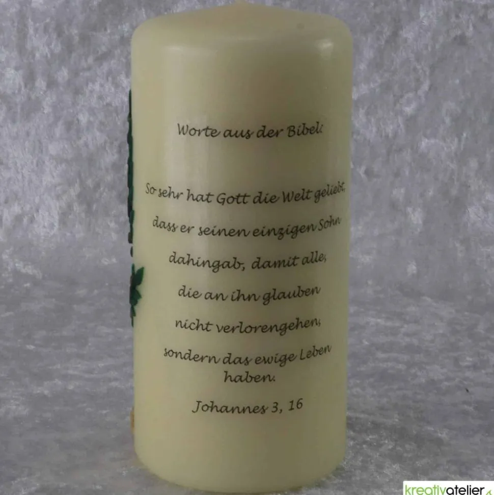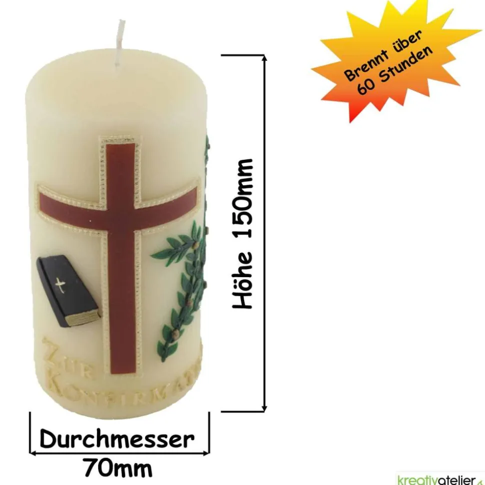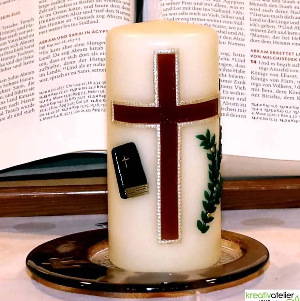 Die Konfirmationskerze „Benjamin“ ist ein besonderes Symbol für den Konfirmanden. Das braune Kreuz und die Bibel zeigen seine Verbindung zum Glauben und die Efeuranke symbolisiert Wachstum und Stärke. Auf Wunsch kann auf der Rückseite auch ein passender Konfirmationsspruch hinzugefügt werden, um die Kerze noch persönlicher zu gestalten. Diese Konfirmationskerze wird sicherlich eine bleibende Erinnerung an diesen wichtigen Tag im Leben des Konfirmanden sein.