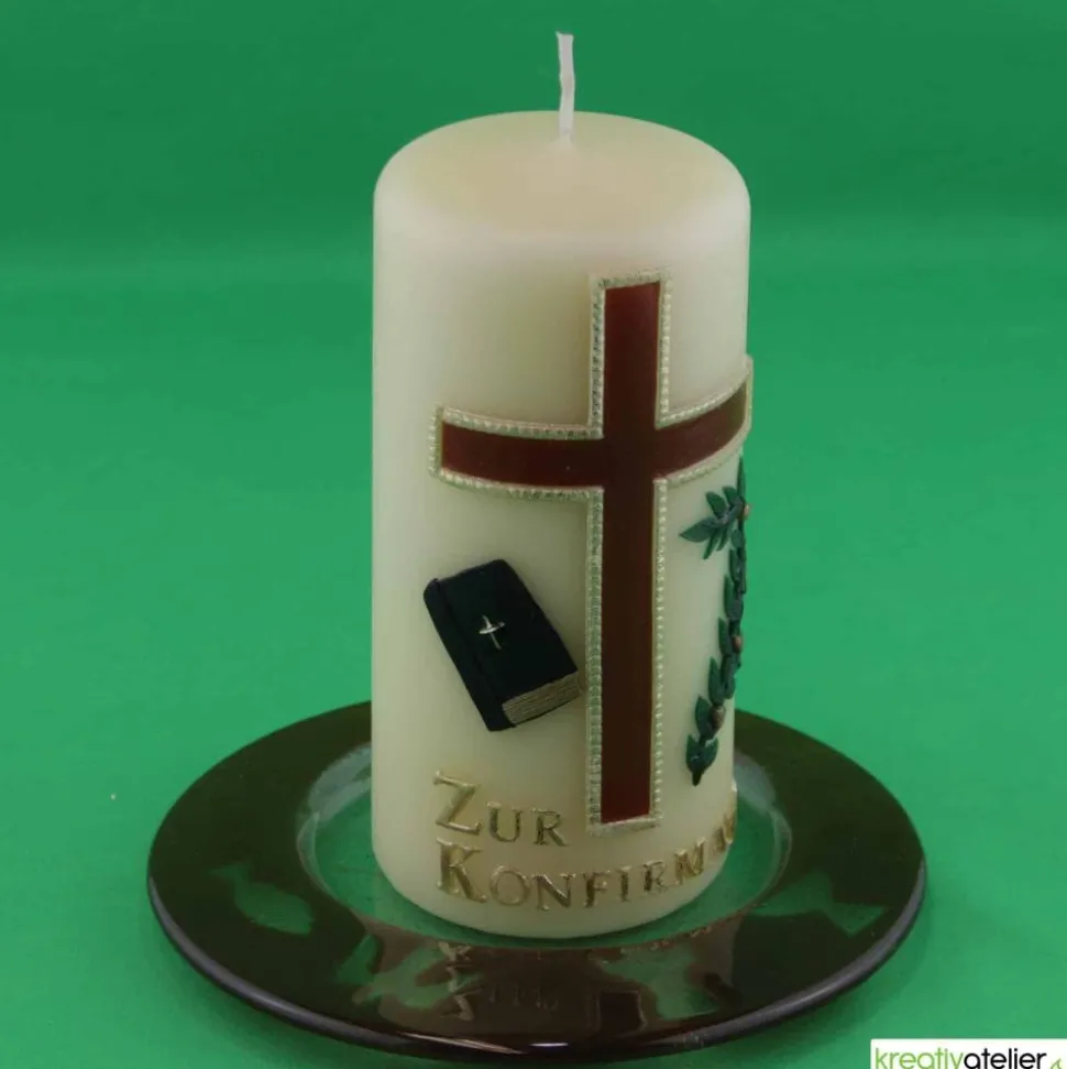 Die Konfirmationskerze kann mit Namen und Datum auf der Rückseite personalisiert werden. Diese Konfirmationskerze wird in meinem Atelier individuell für Sie gefertigt. Meine Rohlinge werden in Deutschland gefertigt und sind qualitativ hochwertig.