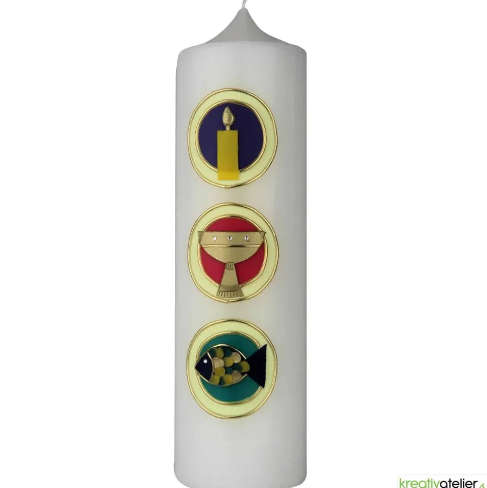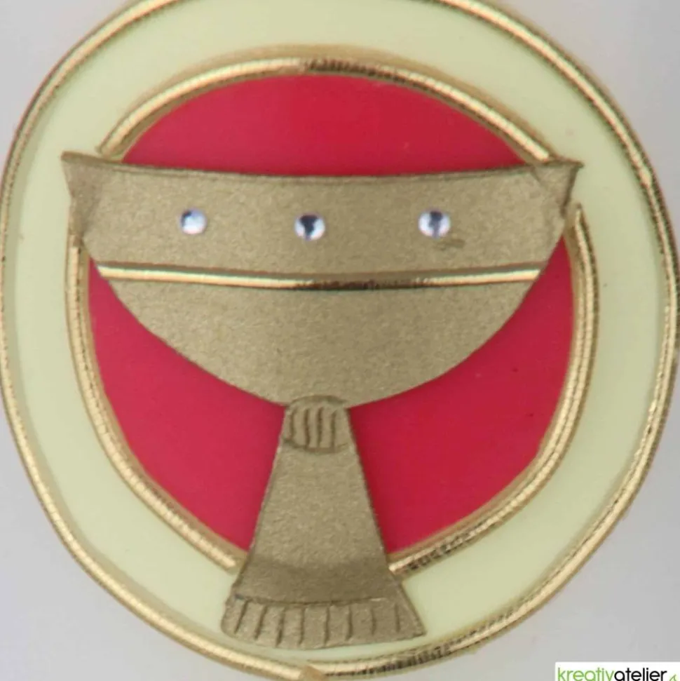 Liebevoll und aufwändig gestaltete Konfirmationskerze mit drei Kacheln, die die christlichen Symbole Licht, Kelch und Fisch abbilden. Die Kacheln bestehen aus zwei Wachslagen und sind mit einem feinen Goldstreifen umrandet. Sie heben sich somit deutlich von der Kerze ab und verleihen ihr so etwas Edles, Erhabenes.
