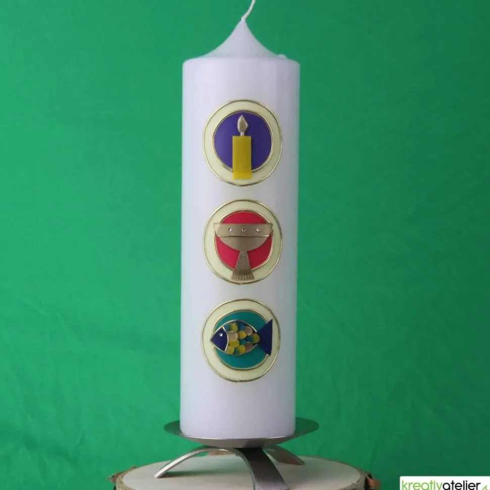 Diese Kerze ist ein Symbol für die Konfirmation und den Glauben an Jesus Christus. Das Licht steht für die Führung Gottes, der Kelch für den Empfang des heiligen Abendmahls und der Fisch für die frühe Christenheit und die Verkündigung des Evangeliums.