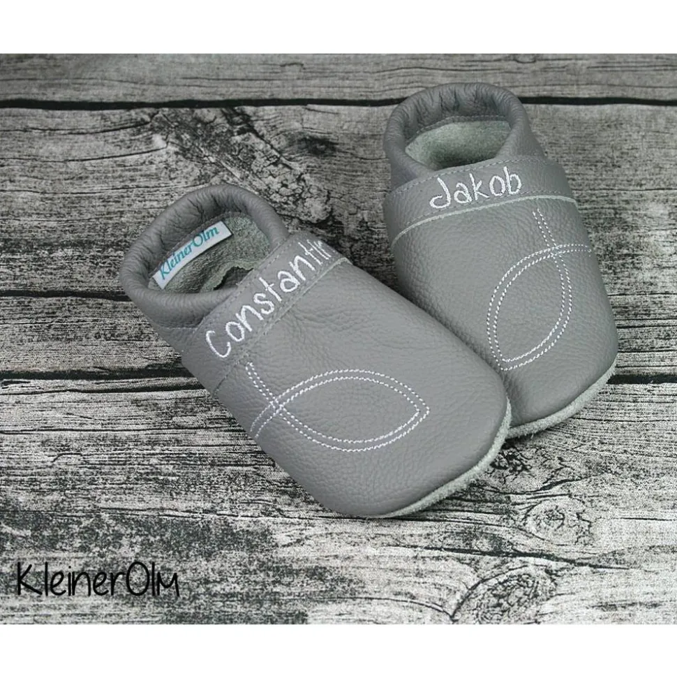 Mit Ichtys Fisch seitlich bestickt. Toll zur Taufe – mit Taufdatum oder Geburtsdatum.