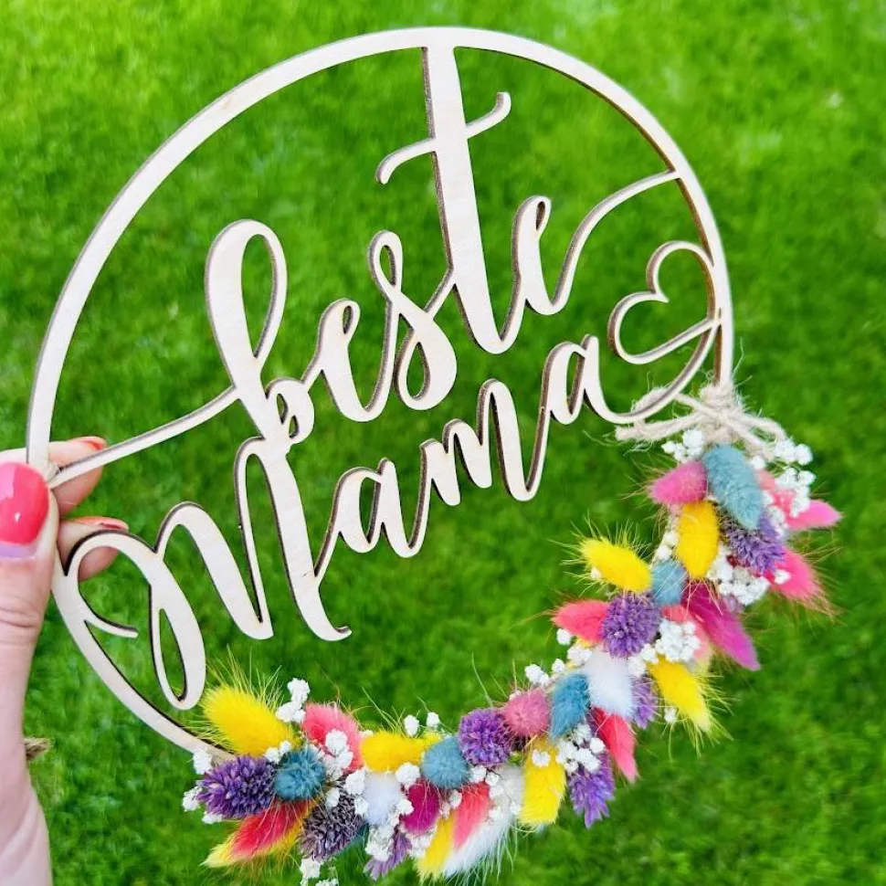 Ob als Herzstück im Flur, im Fenster oder im Wohnzimmer platziert – dieser Kranz wird sicherlich die Augen deiner Mutter zum Strahlen bringen und ihr Herz berühren. Zeige deine Liebe und Dankbarkeit auf besondere Weise mit unserem Holzkranz „Beste Mama“ und sorge somit für ein Geschenk das in Erinnerung bleibt.