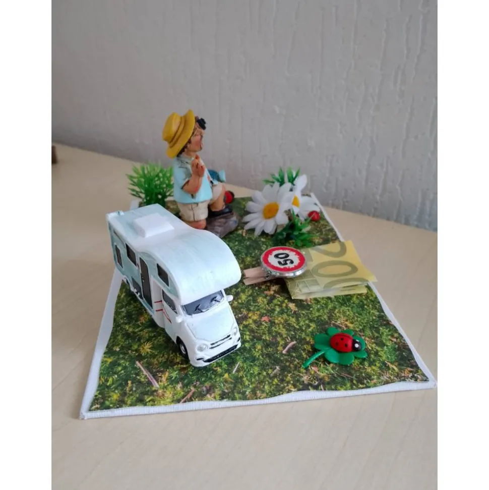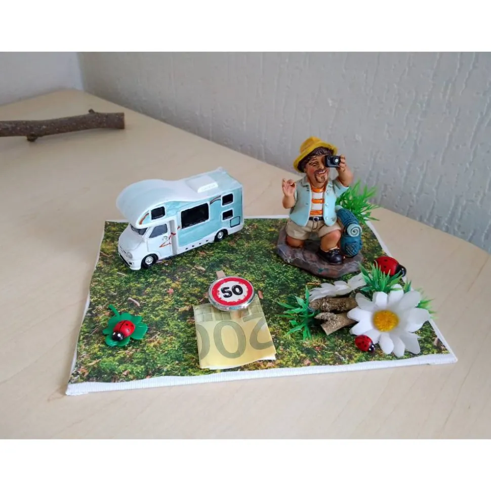 Verschenke ein einzigartiges Geldgeschenk zum 50. Geburtstag, das perfekt für Männer ist, die gerne mit dem Wohnmobil unterwegs sind! Dieses besondere Präsent wird auf einem stabilen Malkarton gestaltet, der mit Rasenmotivpapier liebevoll beklebt wird. Das Highlight ist eine Geldklammer, die mit einem Schild im Stil eines Verkehrszeichens mit der Zahl 50 verziert ist – gerne kannst du auch eine andere runde Zahl wählen!