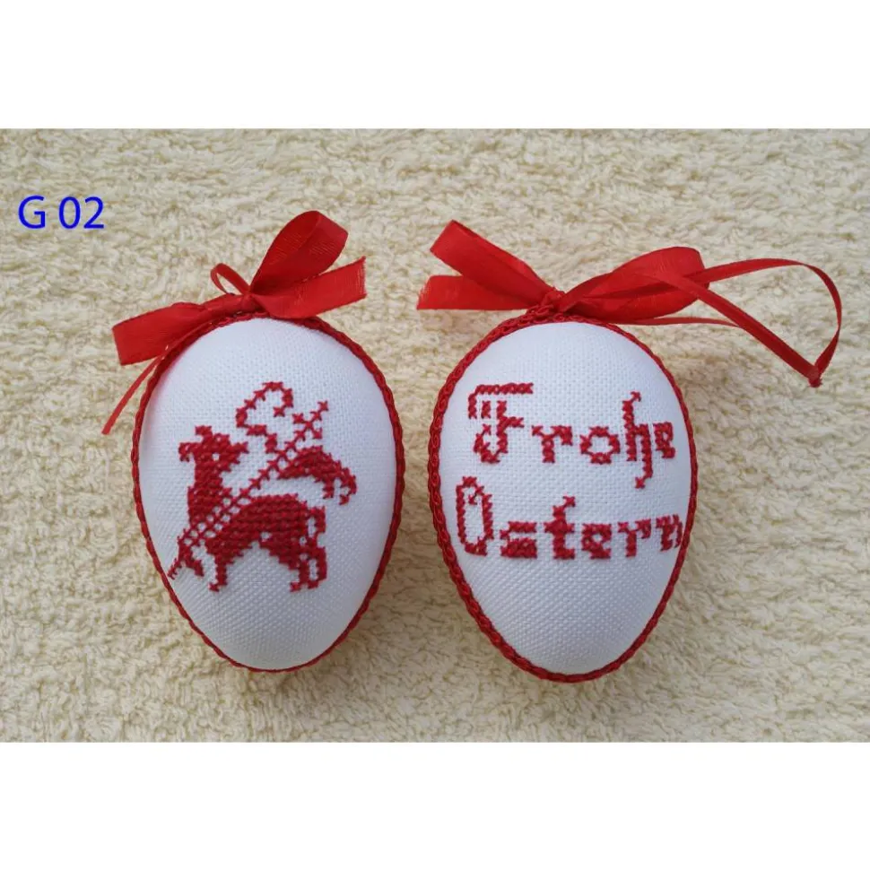 Das Ei ist beidseitig mit verschiedenen Motiven, in Kreuzstich, bestickt und mit Schleife und Schlingenborte verziert.
