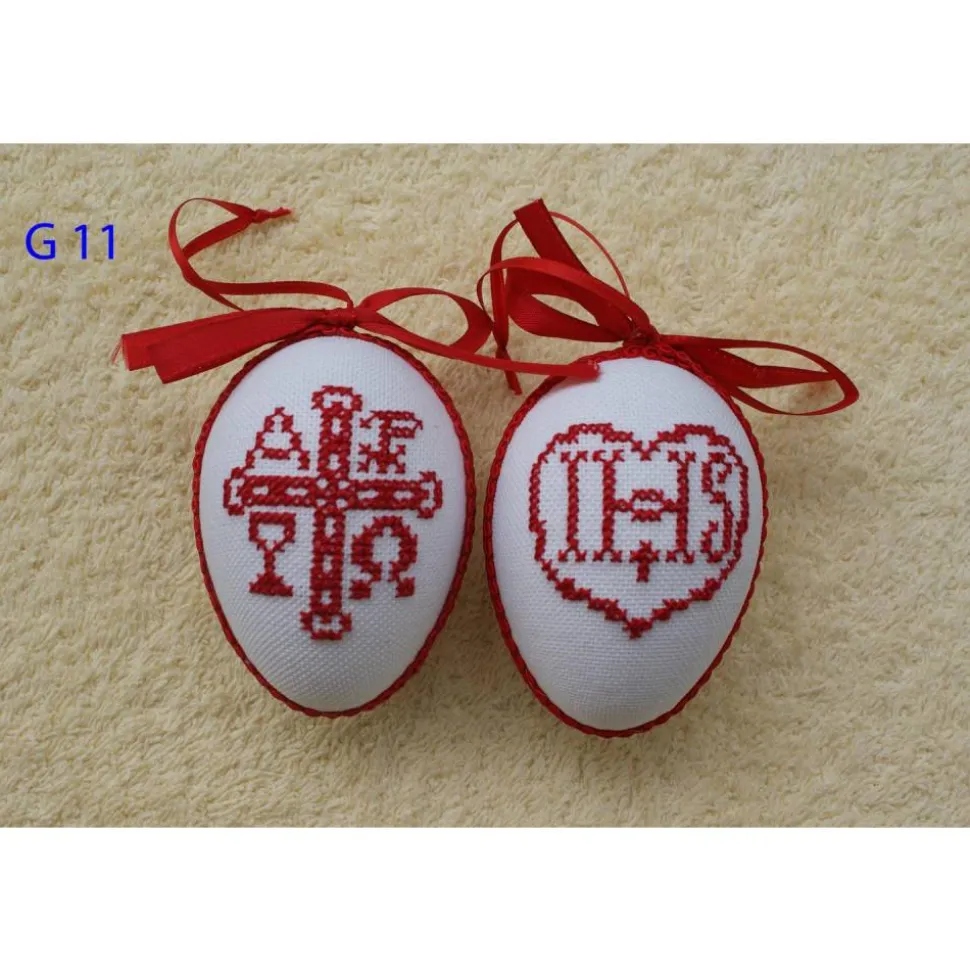 Kreuzstich Osterei Handarbeit gestickt  religiöses Motiv   9cm, rot weiß,
