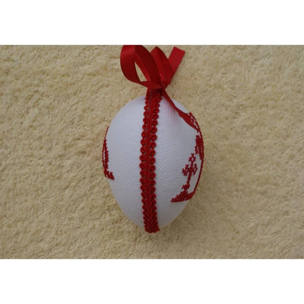 Das Ei ist beidseitig mit verschiedenen Motiven, in Kreuzstich, bestickt und mit Schleife und Schlingenborte verziert.
