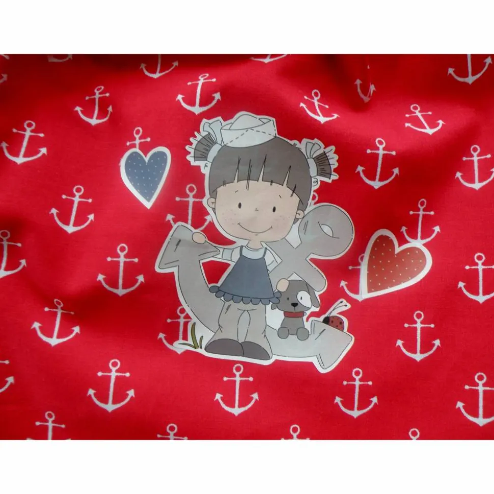 Ich habe den “ Krims – Krams “ Büdel aus einer rot / weißen Baumwolle mit Ankermotiven genäht, das Futter, ebenfalls aus Baumwolle, ist grau.