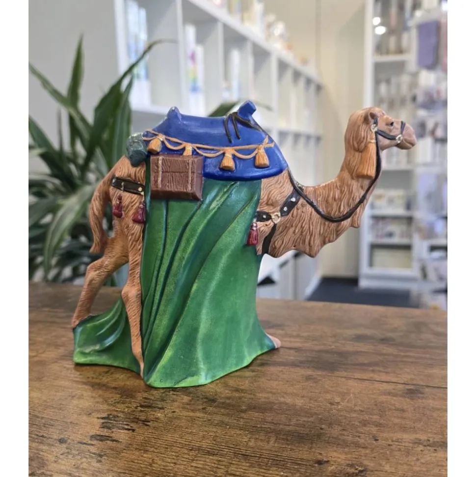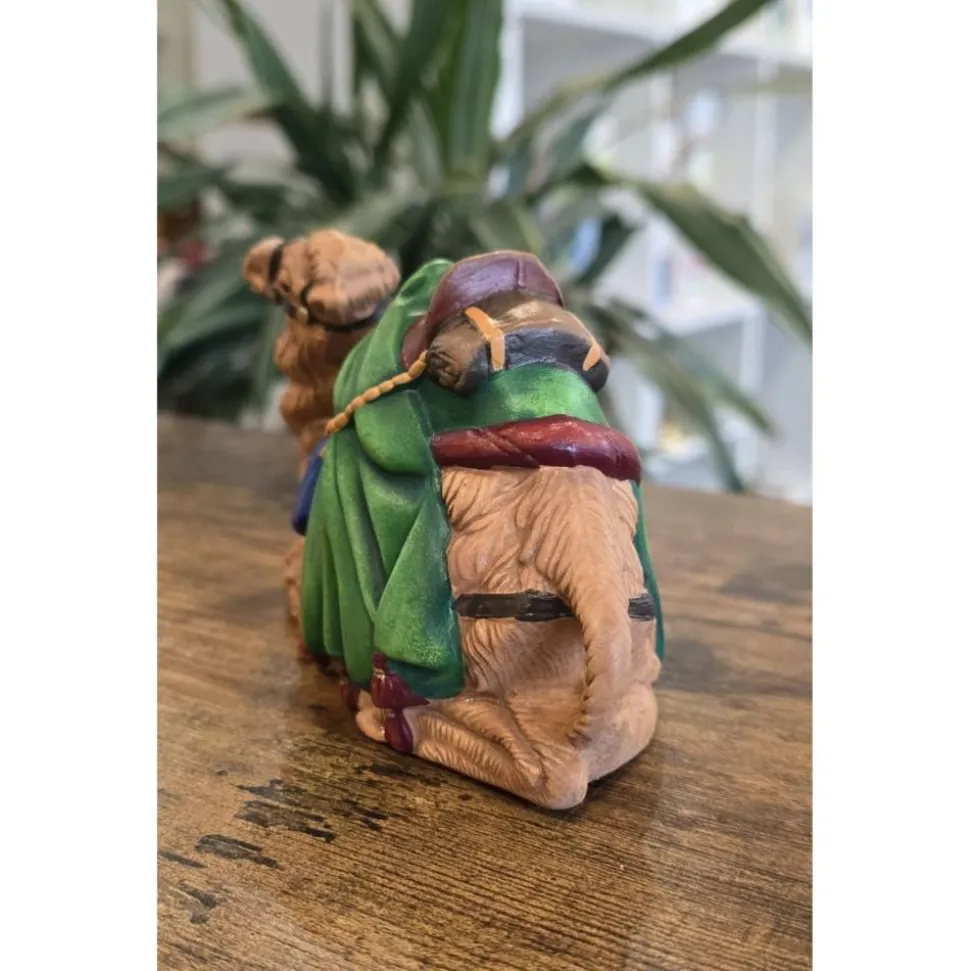 Diese Figuren aus hochwertiger Keramik zeigen zwei kunstvoll gestaltetes Kamele, die mit einem farbenfrohen Sattel und einer dekorativen Decke und Tasche verziert sind. Die Figuren schaffen einen beeindruckenden Blickfang und ist ein Highlight.