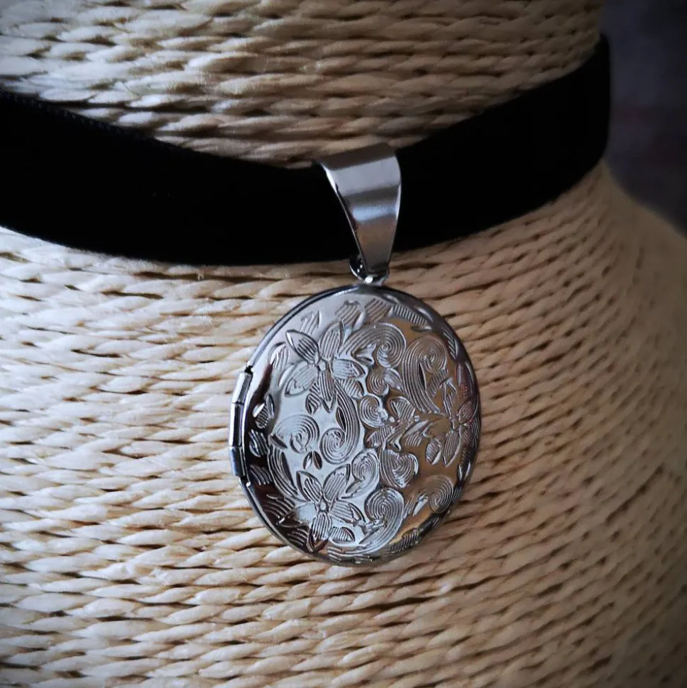 Die Kette ist aus hochwertigem Samtband gefertigt, während die Medaillons und Verschlüsse aus Edelstahl bestehen.