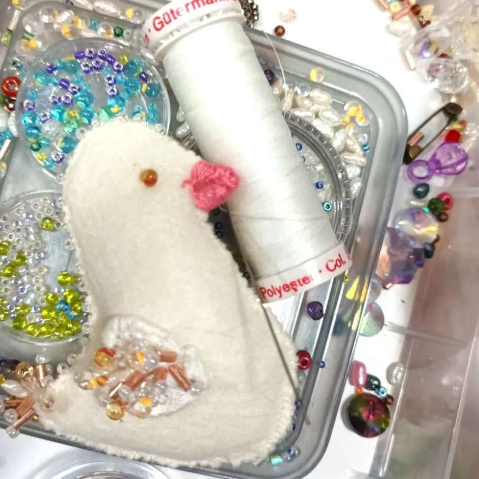 Das perlenbestickte Ornament ist innen gepolstert, von beiden Seiten aufwändig bestickt und funkelt wertig im Licht. Das kommt besonders schön zur Geltung beim Einsatz des Osterküken als Deko im Osterstrauß oder Taufgesteck. Opulentes Osterküken mit einer Höhe von etwa 9 Zentimeter und einer Breite von 6 cm.und durch die Füllung und die Perlenstickerei ist dieses Ornament etwa 2 cm stark. Komplette Länge mit Kettchen 20 cm. Diese Variation des Ornament sieht auch toll aus als Schlüsseldeko zum shabby chic Stil oder Landhaus Ambiente am vintage Schrank oder Sekretär.