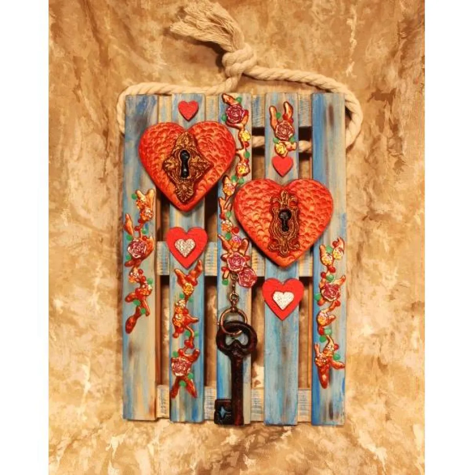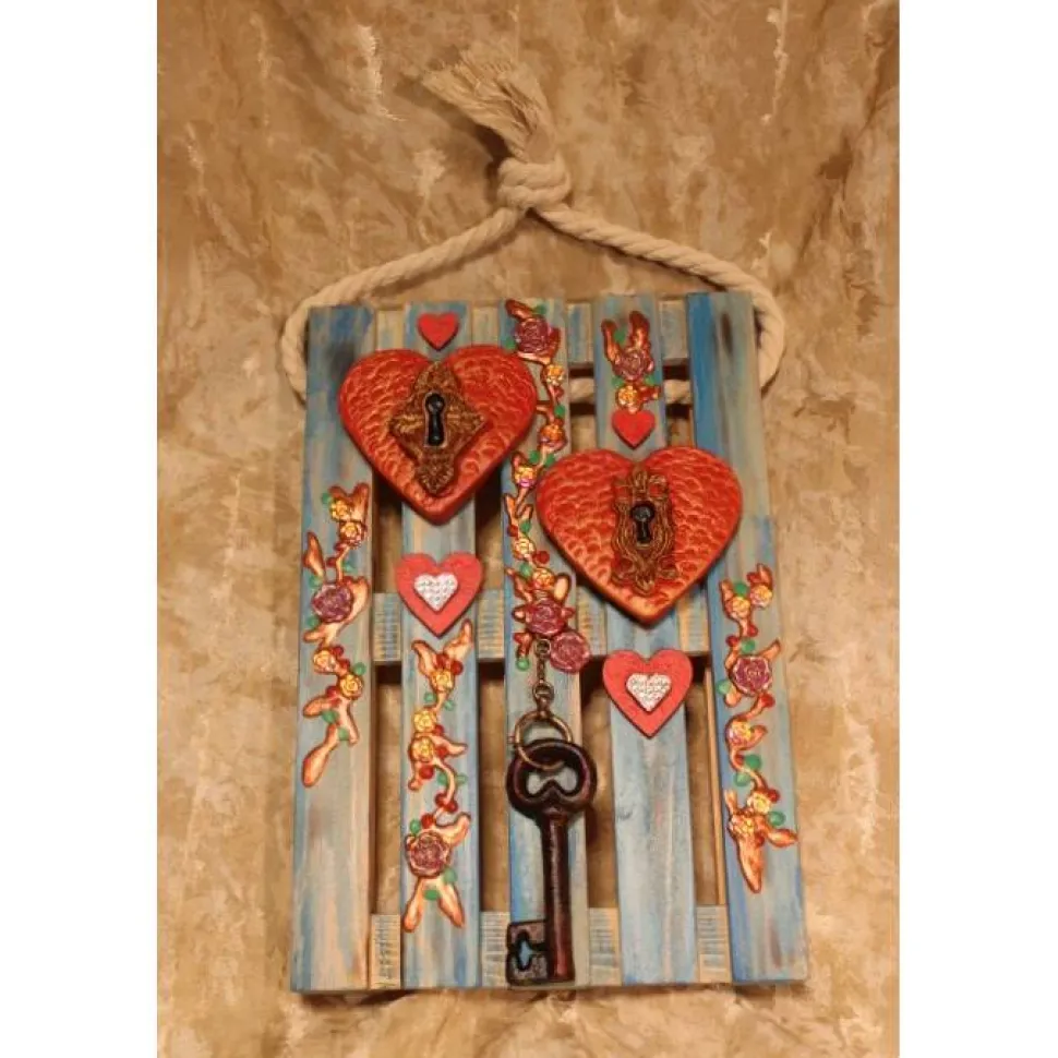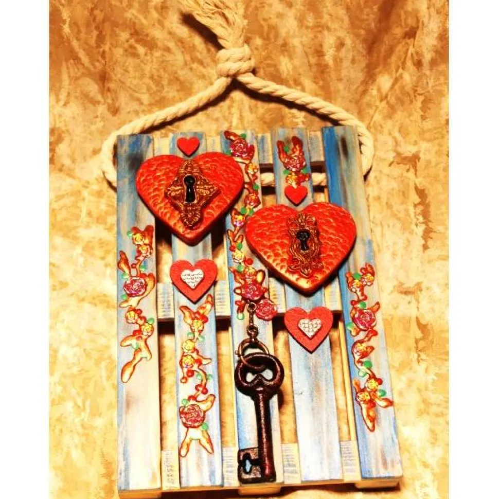 Acrylmalerei/Collage auf einer Mini-Dekopalette im verspielten Shabby- Stil. Witzige Wohndeko, künstlerisch gestaltet mit Modelliermasse, maritimen Applikationen in Rosenform aus Kunststoff, Glitzersteinen, Holzherzen, und einem Schlüssel aus Metall. Wunderschöne, strahlende Farben mit Kupfereffekten verziert.