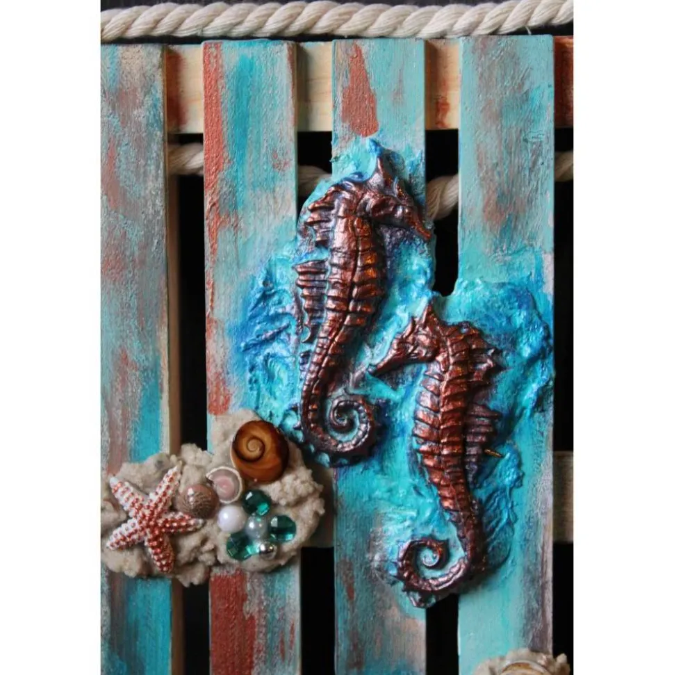 Acrylmalerei/Collage auf einer Mini-Dekopalette im maritimen Stil. Witzige Wohndeko, künstlerisch gestaltet mit Modelliermasse, maritimen Applikationen aus Polyresin, Glitzersteinen, Muscheln, Perlen und Sand. Wunderschöne strahlende Farben mit Gold- und Kupfereffekten verziert.