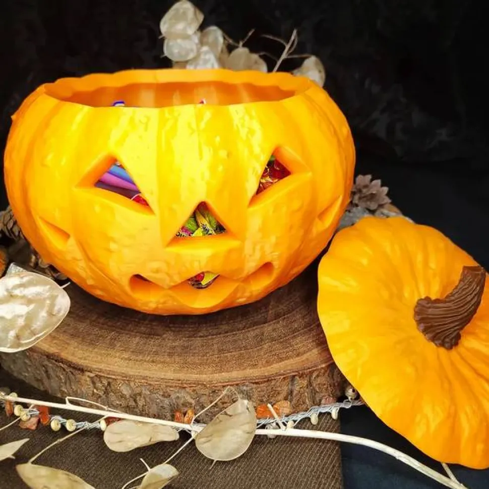 Große Kürbiskopfschale mit Deckel aus Kunststoff.