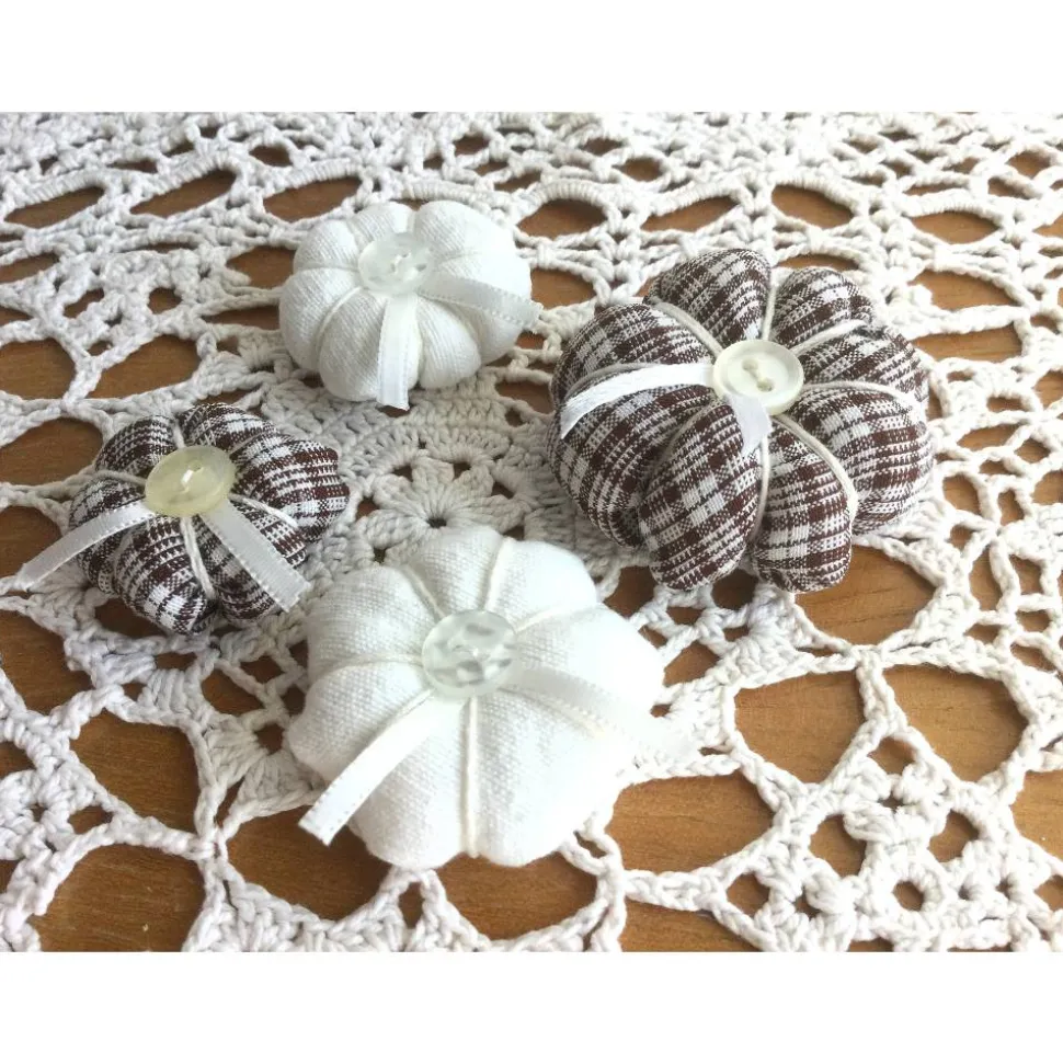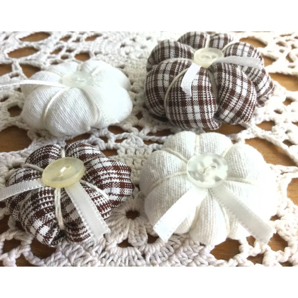 Die Kürbisse sind unterschiedlich groß. Zwei sind aus einem braun-beige-karierten Baumwollstoff und die anderen beiden habe ich aus einem cremefarbigen Baumwollstoff genäht. Verziert sind die Kürbisse mit je einem kleinen weißen Knopf und einem weißen Satinband. Gefüllt sind die Stoff-Kürbisse mit Bastelwatte.