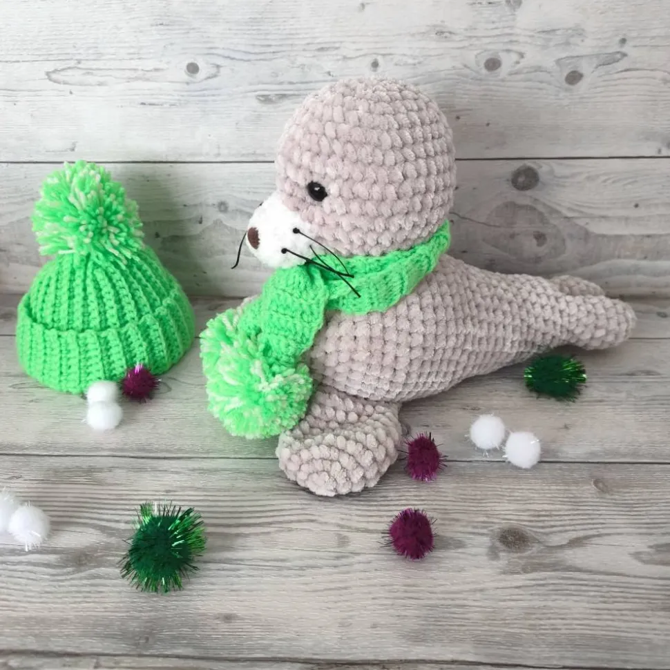 Entdecke diese einzigartige, handgefertigte Robbe mit weichem, beigem Fell. Mit ihren ca. 21 cm Höhe und 26 cm Länge ist sie das perfekte Kuscheltier für kleine und große Meeresfreunde. Die grüne, neonfarbene Mütze und der passende Schal lassen sich abnehmen – du kannst deiner Robbe immer wieder einen neuen Look verleihen!