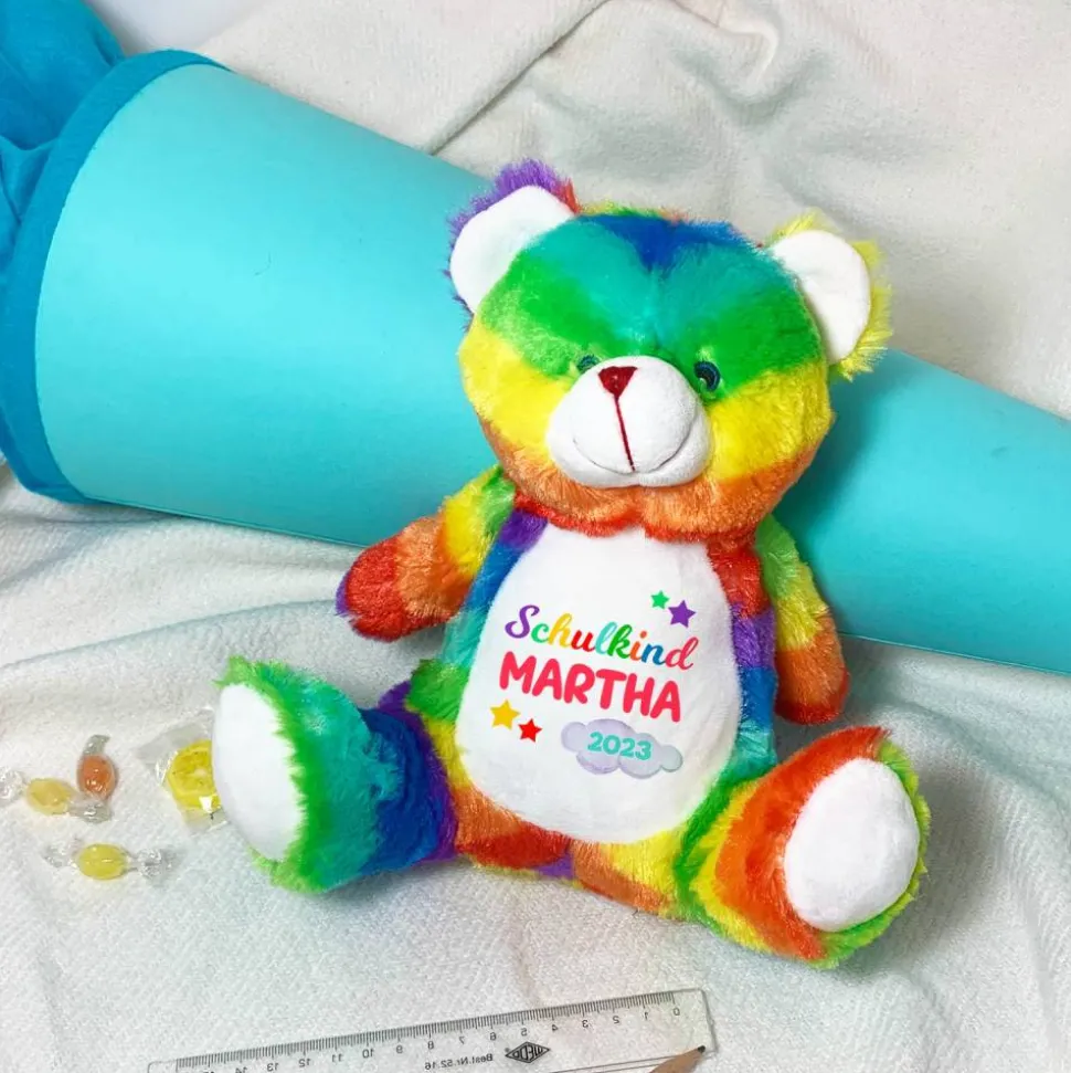 Welches Schulkind wünscht sich nicht, mutig und stark wie ein Löwe zu sein oder so weise und schlau wie eine Eule? Farbenfroh ist unser Teddy in bunten Regenbogen-Farben, unsere beiden kuscheligen Häschen in grau und weiß lassen Kinderherzen höher schlagen und die kleine schwarze Katze begleitet das Schulkind auf leisen Pfoten zu diesem spannenden und aufregenden Tag.