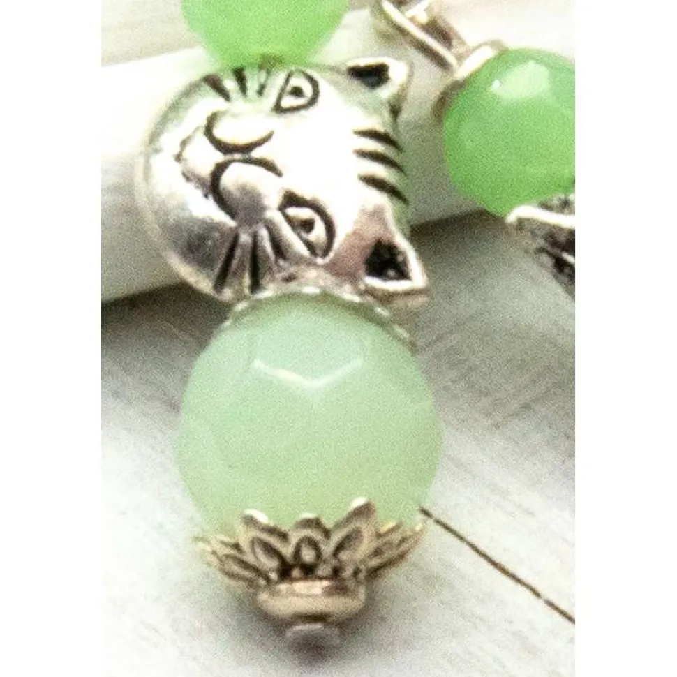 Verleihe deinem Look einen funkelnden Touch mit diesen individuellen Ohrringen aus grünen Glasperlen und silberfarbenen Metallelementen in Katzenform. Genieße das angenehme Tragegefühl dank der 925er Silber Brisur und ziehe mit dem einzigartigen Bohemian-Design alle Blicke auf dich.