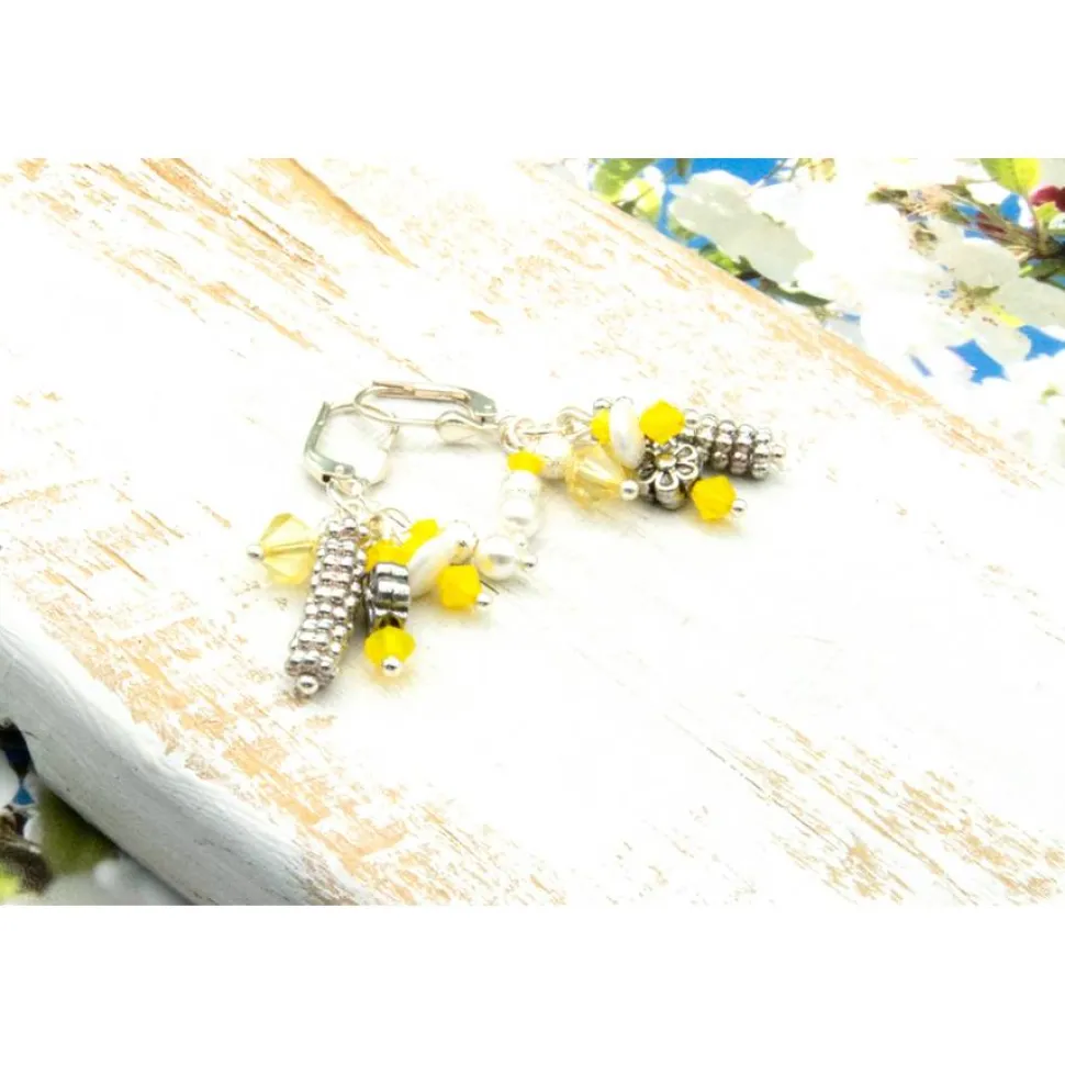 Verleihe deinem Look einen funkelnden Touch mit diesen leichten Ohrhängern aus gelben Glasschliffperlen, Kunststoffelementen und silberfarbenen Metallelementen. Genieße das angenehme Tragegefühl dank der 925er Silber Brisur und ziehe mit dem einzigartigen Bohemian-Design alle Blicke auf dich.