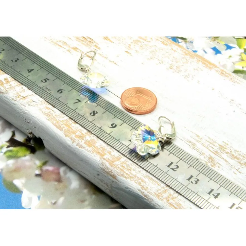 Diese leichten Ohrhänger sind mit kleinen runden irisierenden Glasschliffanhängern in Crystal und Silberfarben gefertigt. Die Länge der Ohrhänger beträgt ca.: 3,1 cm, das Gewicht pro Ohrhänger ca.: 1,9 Gramm