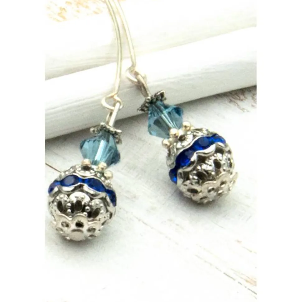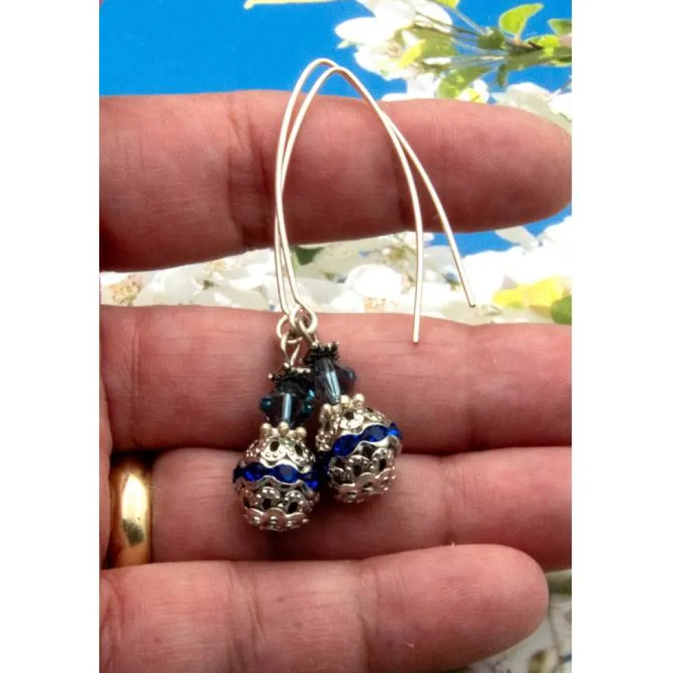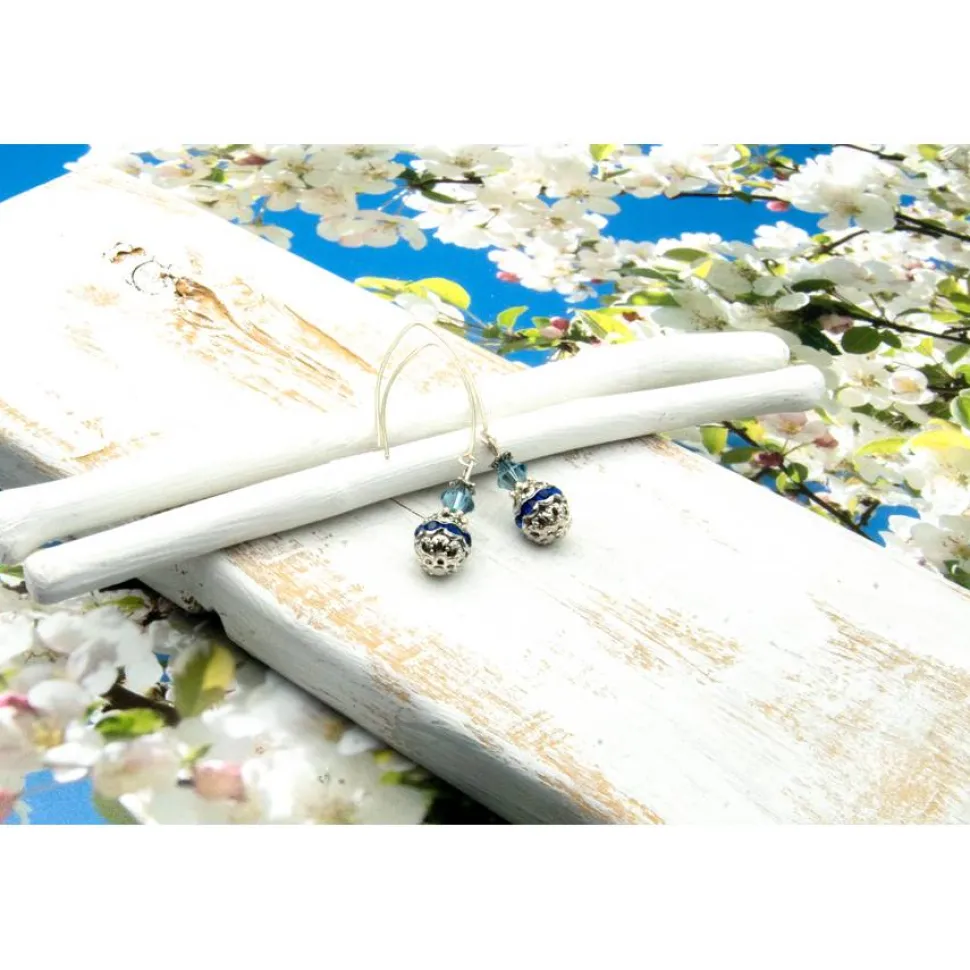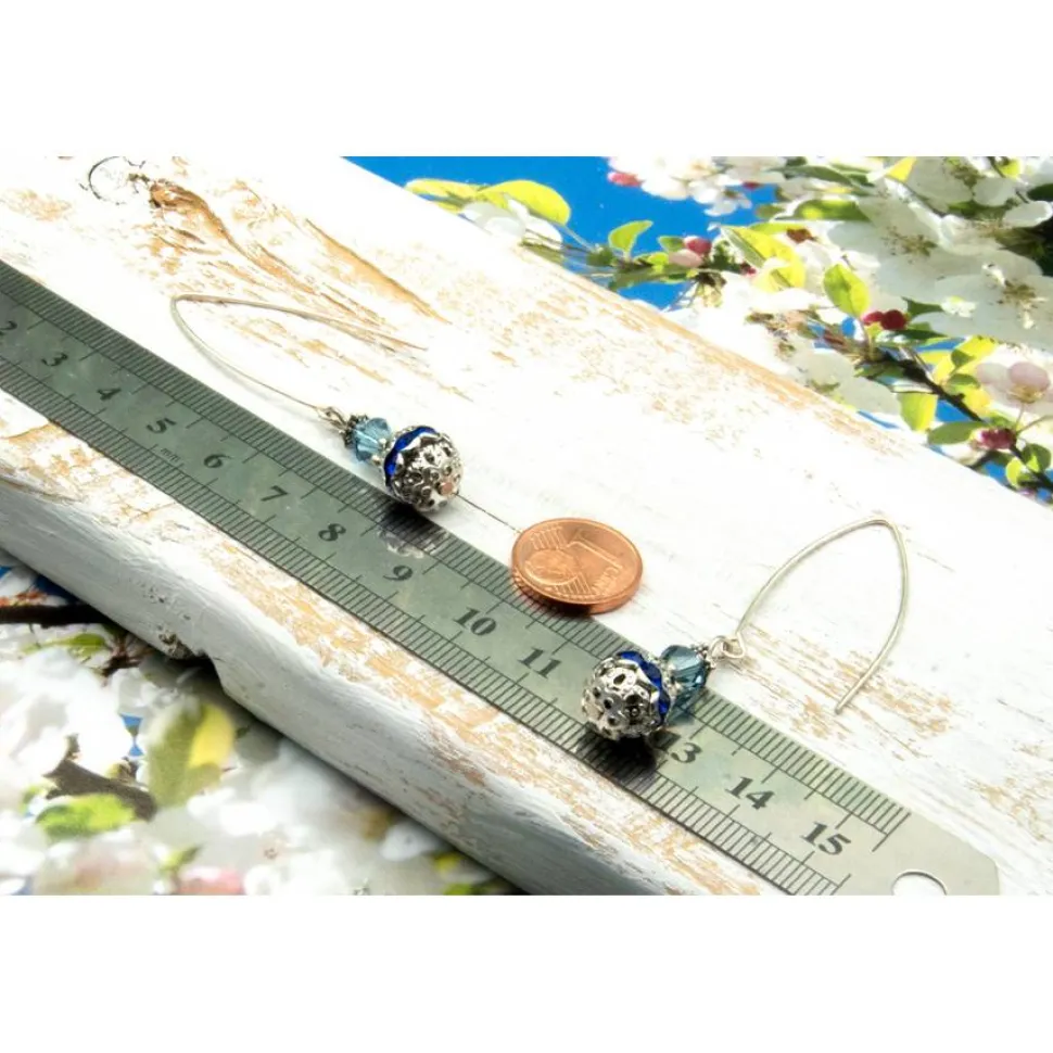 Diese langen, leichten Ohrhänger sind mit Metallanhängern, Silber und Glas in Blau und Silberfarben gefertigt. Die Länge der Ohrhänger beträgt ca.: 5,8 cm, das Gewicht pro Ohrhänger ca.: 1,7 Gramm.