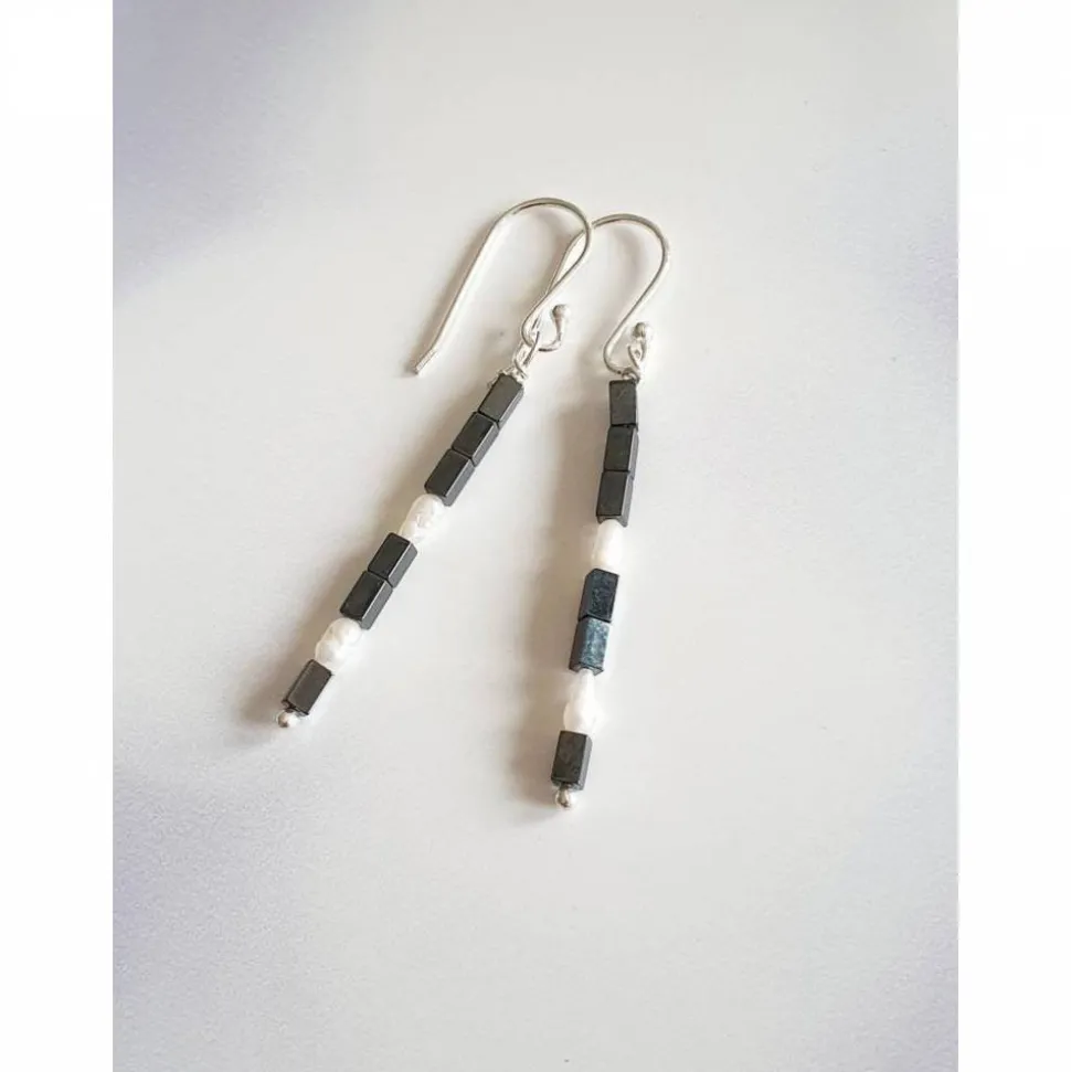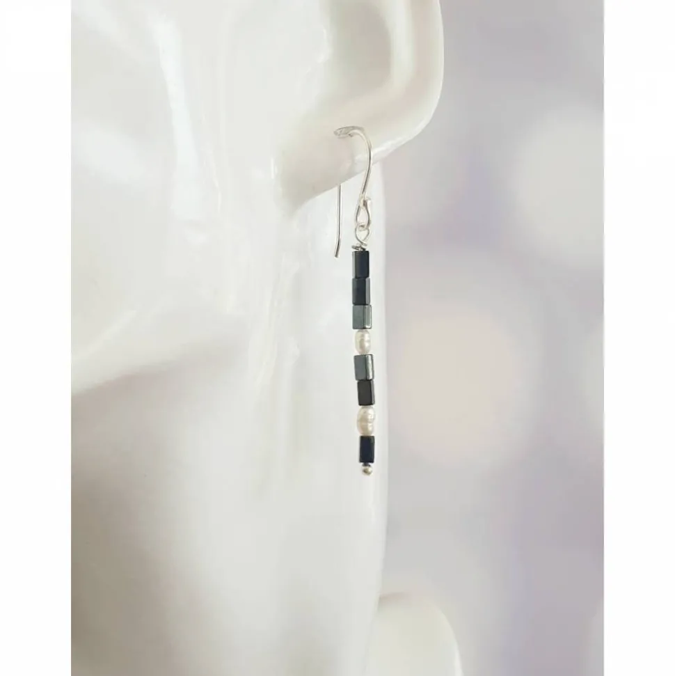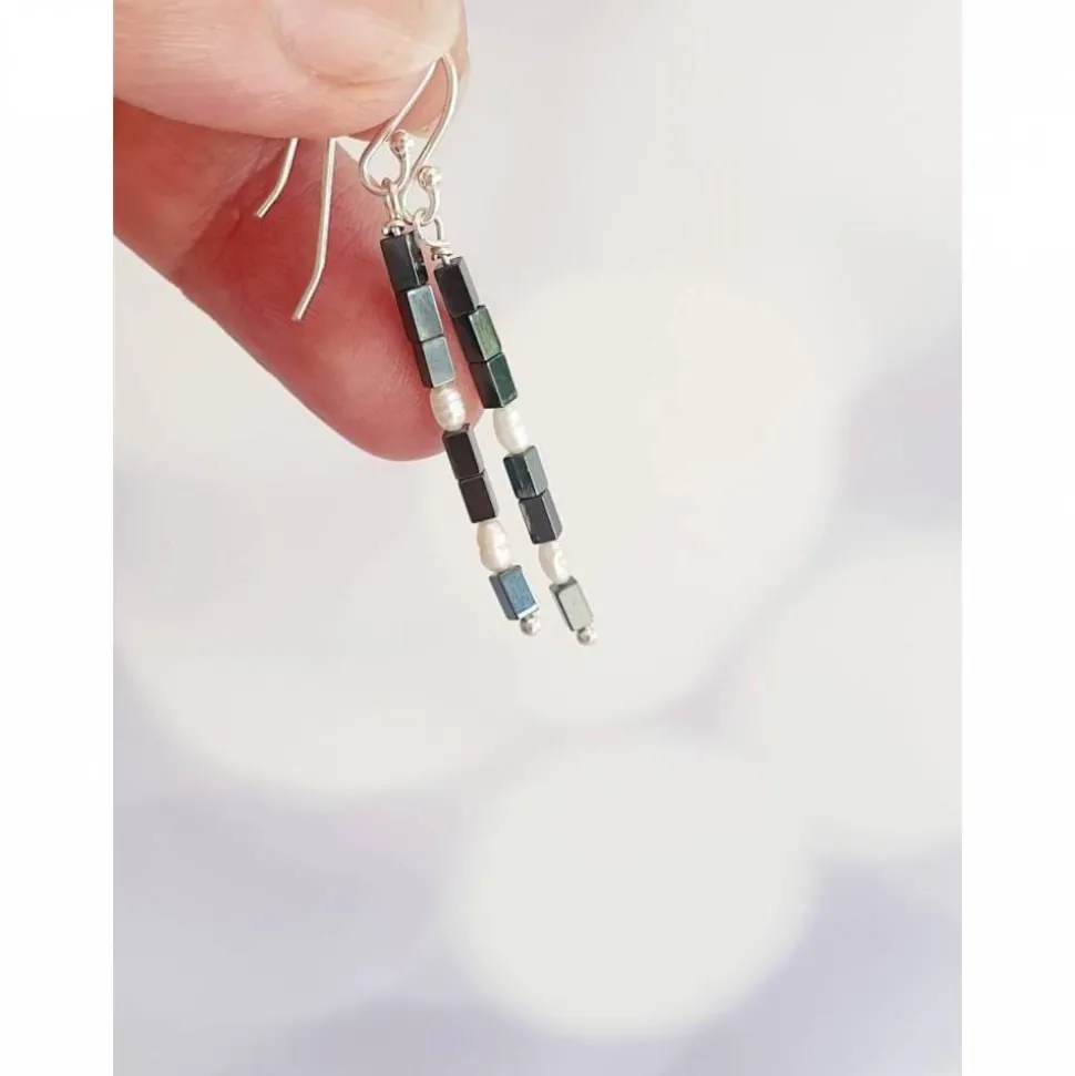 Lange elegante und schmale Ohrringe aus Silber mit schwarzen kleinen Würfeln und kleinen Süßwasser Reisperlen.