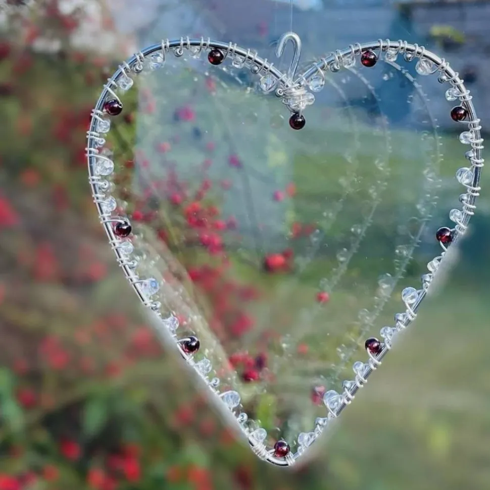 Dieser Fensterschmuck wird liebevoll als Handarbeit gefertigt. Jedes Herz wird sorgfältig aus rostfreien Aluminiumdraht geformt und mit glänzenden Glasperlen und Energie spendenden Heilsteinen dekoriert. Jeder Fensterschmuck ist ein Unikat mit 8 Heilsteinen und einer Größe von ungefähr 10 x 10 cm.
