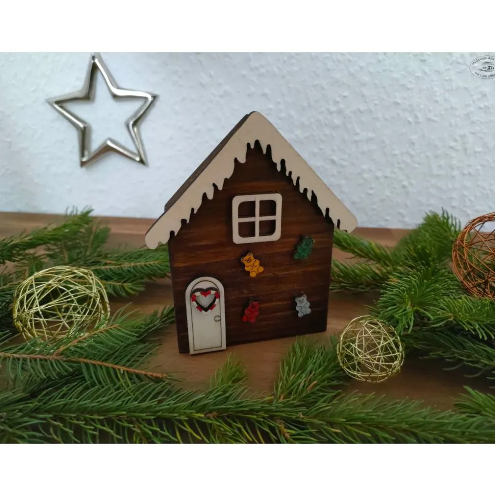 Mitseiner niedlichen Gestaltung in Form eines kleinen Lebkuchen-/Pfefferkuchenhaus mit Gummibärchen kann dieses auch wunderbar als Wichtelhäuschen verwendet werden.