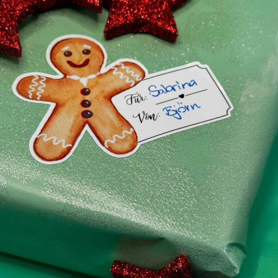 Dieses weihnachtliche Vinyl-Geschenketikett zeigt einen freundlich lächelnden Lebkuchenmann, hinter dem ein Etikett mit den Feldern „für“ und „von“ platziert ist. Das Motiv wurde von mir als Originalillustration mit Aquarellfarben auf Papier handgemalt, anschließend digitalisiert und als Sticker umgesetzt.