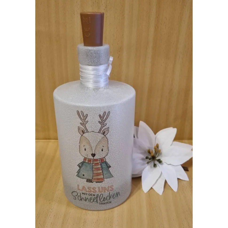 Die Flasche ist in zwei Schritten mit einer Satinierfarbe grundiert. Nach Auswahl des Motivs wird dieses auf Wasserschiebefolie gedruckt und versiegelt. Nachdem trocknen wird das Motiv auf die Flasche gebracht. Im Anschluss wird farblich passendes Satinband um den Flaschenhals gewickelt und der Korken mit den LED´s angebraucht.