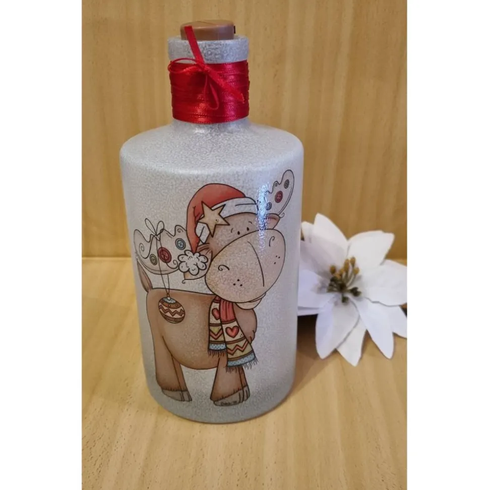 Die Flasche ist in zwei Schritten mit einer Satinierfarbe grundiert. Nach Auswahl des Motivs wird dieses auf Wasserschiebefolie gedruckt und versiegelt. Nachdem trocknen wird das Motiv auf die Flasche gebracht. Im Anschluss wird farblich passendes Satinband um den Flaschenhals gewickelt und der Korken mit den LED´s angebraucht.