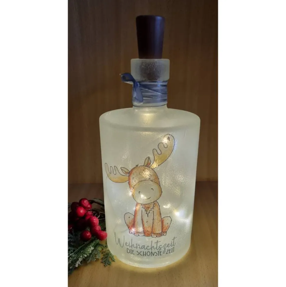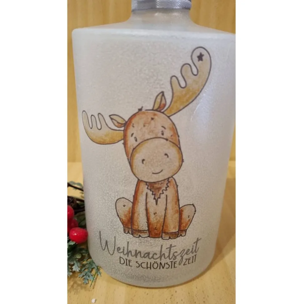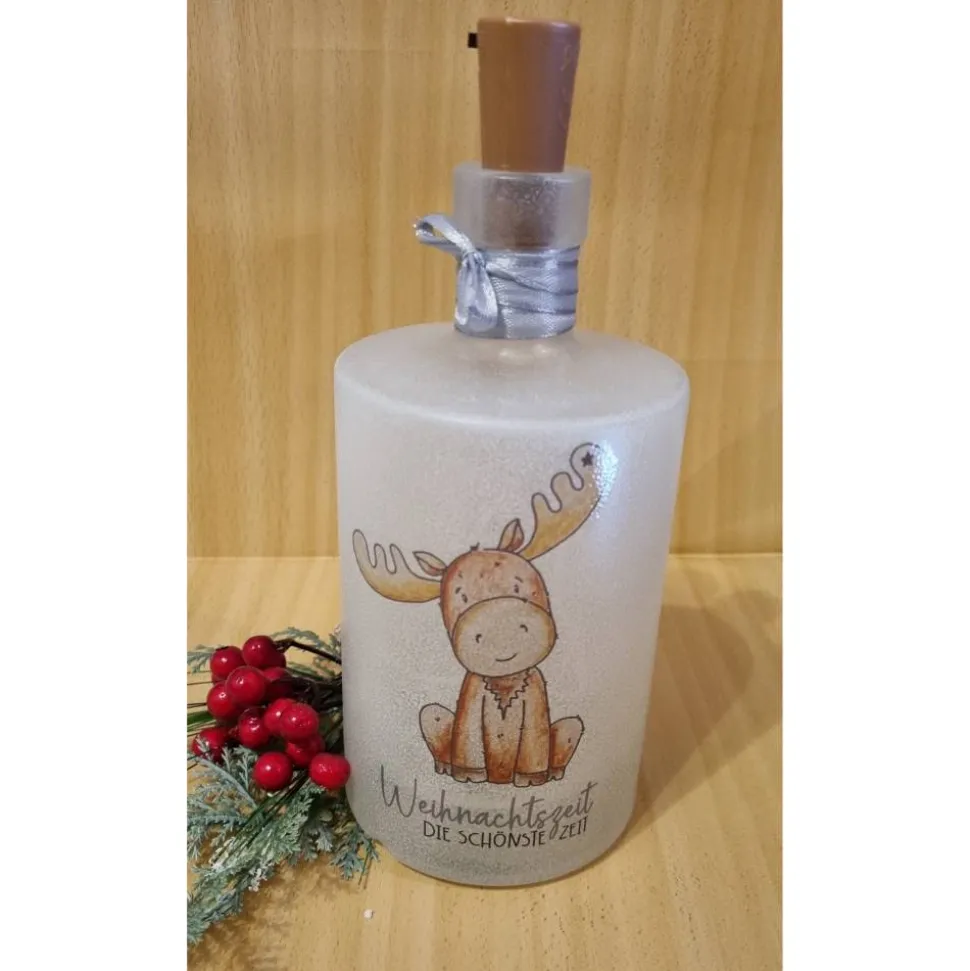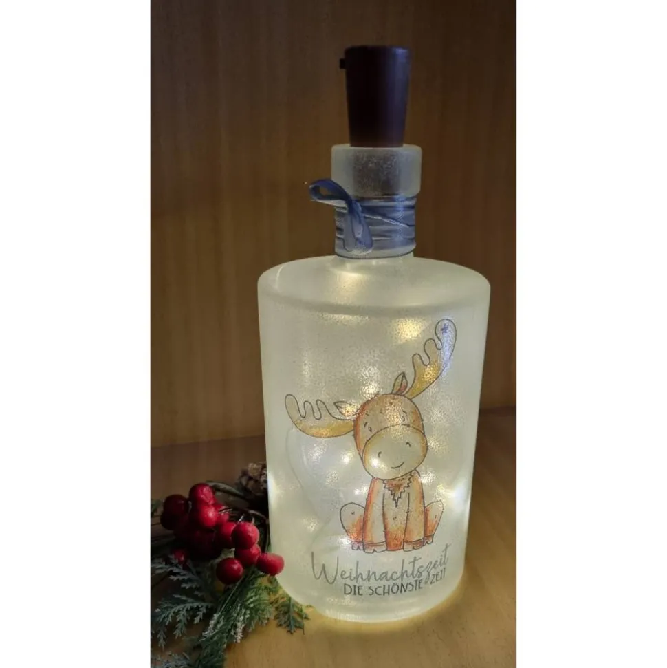 Die Flasche ist in zwei Schritten mit einer Satinierfarbe grundiert. Nach Auswahl des Motivs wird dieses auf Wasserschiebefolie gedruckt und versiegelt. Nachdem trocknen wird das Motiv auf die Flasche gebracht. Im Anschluss wird farblich passendes Satinband um den Flaschenhals gewickelt und der Korken mit den LED´s angebraucht.
