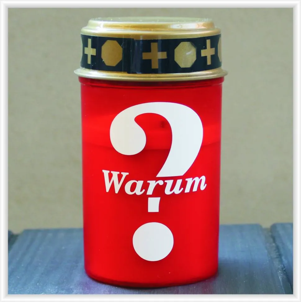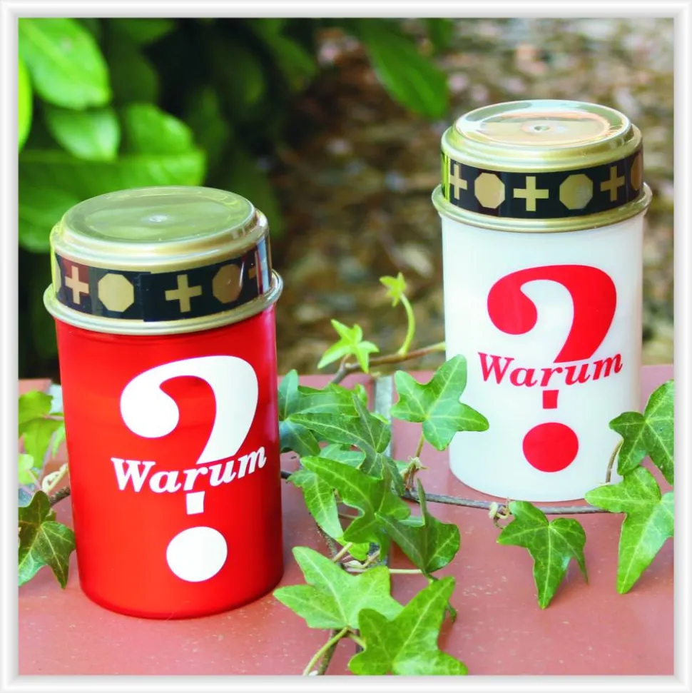 Ihr erhaltet hier ein individuell gestaltetes LED-Grablicht, mit der Aufschrift „Warum?“ (rotes LED Grablicht mit weißer Aufschrift, weißes LED Grablicht mit roter Aufschrift), welches einem originalen Grablicht täuschend echt nachempfunden wurde.