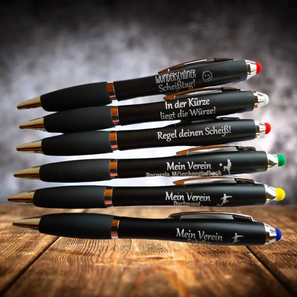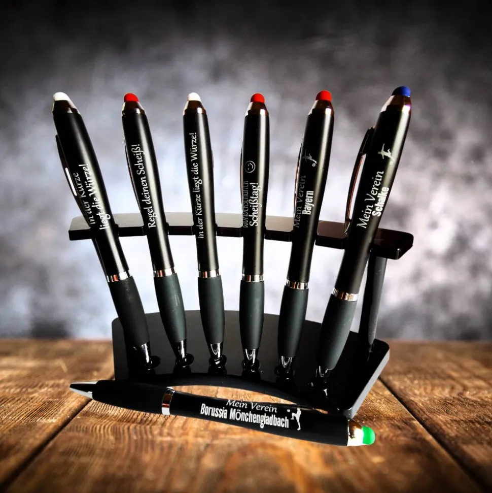 Entdecke die perfekte Verbindung aus Funktion und Design! Der LED Kugelschreiber ist der ideale Begleiter für alle, die auch im Dunkeln den Durchblick behalten wollen. Wähle einen passenden Spruch aus oder gib deinen Wunschnamen oder Firmennamen zur Personalisierung an. Eigene Texte sind auf Anfrage gegen Aufpreis möglich.