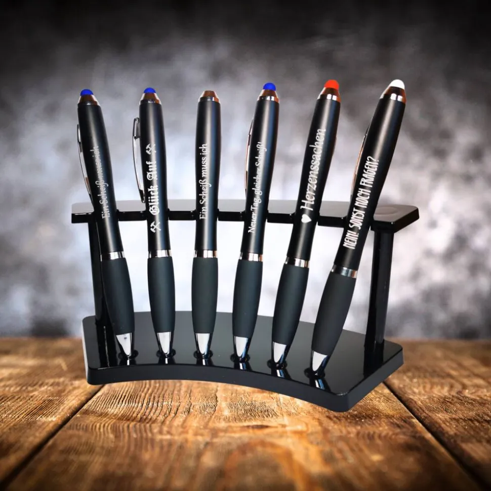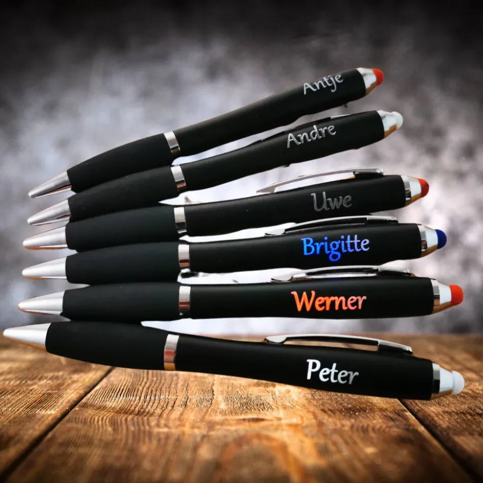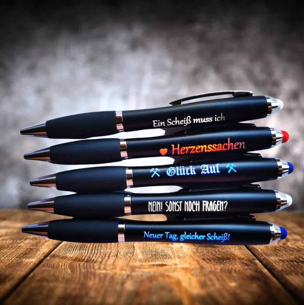 Erlebe Schreiben neu mit dem innovativen LED Kugelschreiber mit beleuchteter Schrift! Dieser besondere Stift kombiniert modernste Technologie mit praktischer Funktionalität und ist das ideale Accessoire für alle, die einen ausgewählten Spruch oder Namen auch im Dunkeln sehen möchten.
