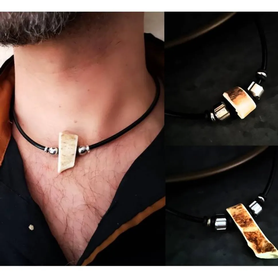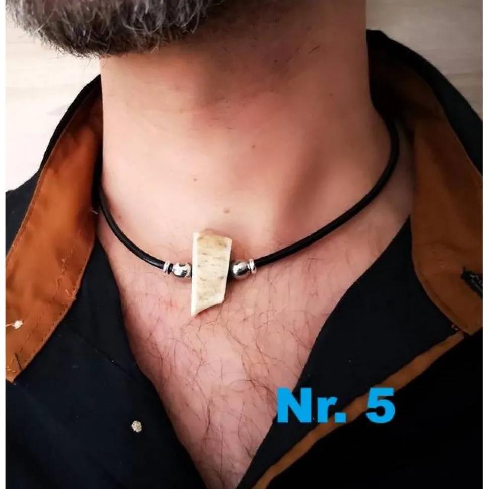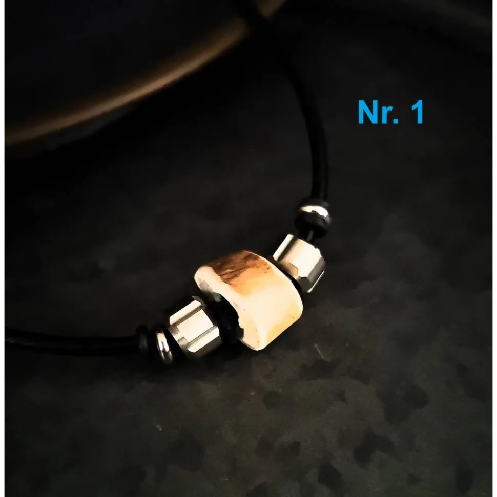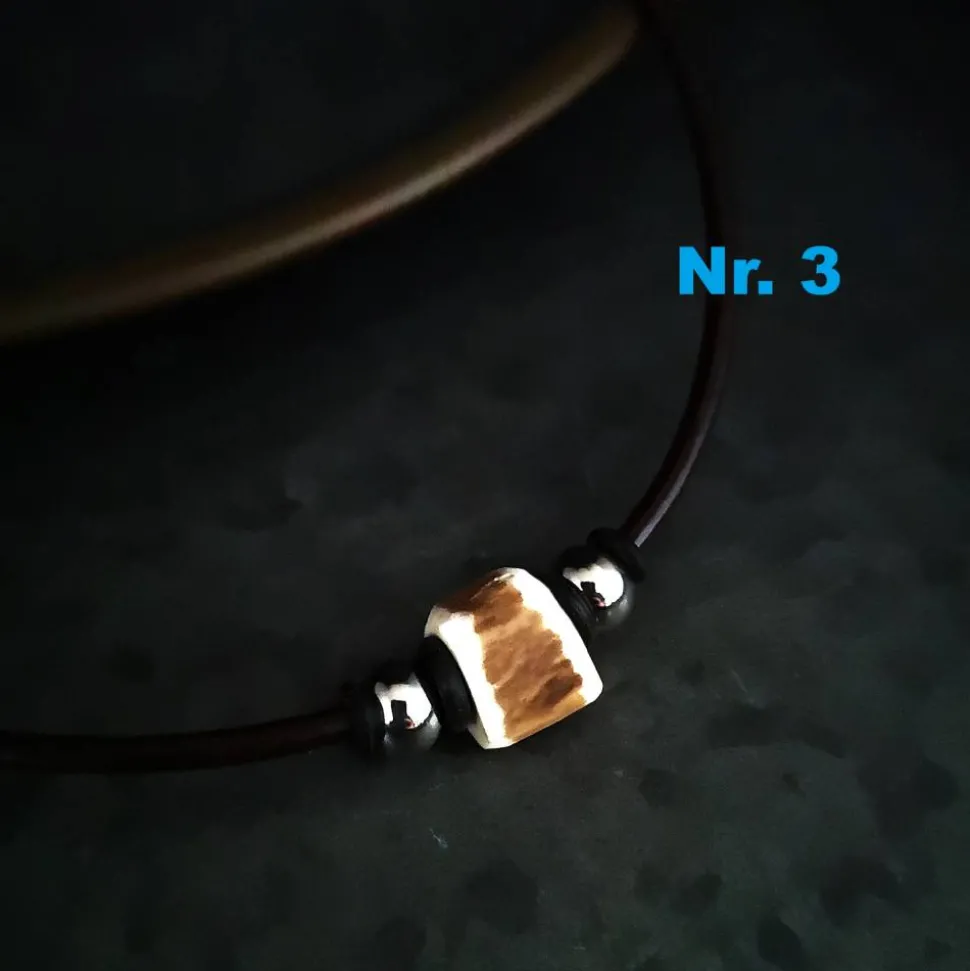 Hergestellt aus glattem Rindsleder und veredelt mit Edelstahlkugeln und einem Hornanhänger in verschiedenen Designs – sei es ein schlankes, längliches Horn, eine kleine Hornperle oder eine auffällige Hornperle.